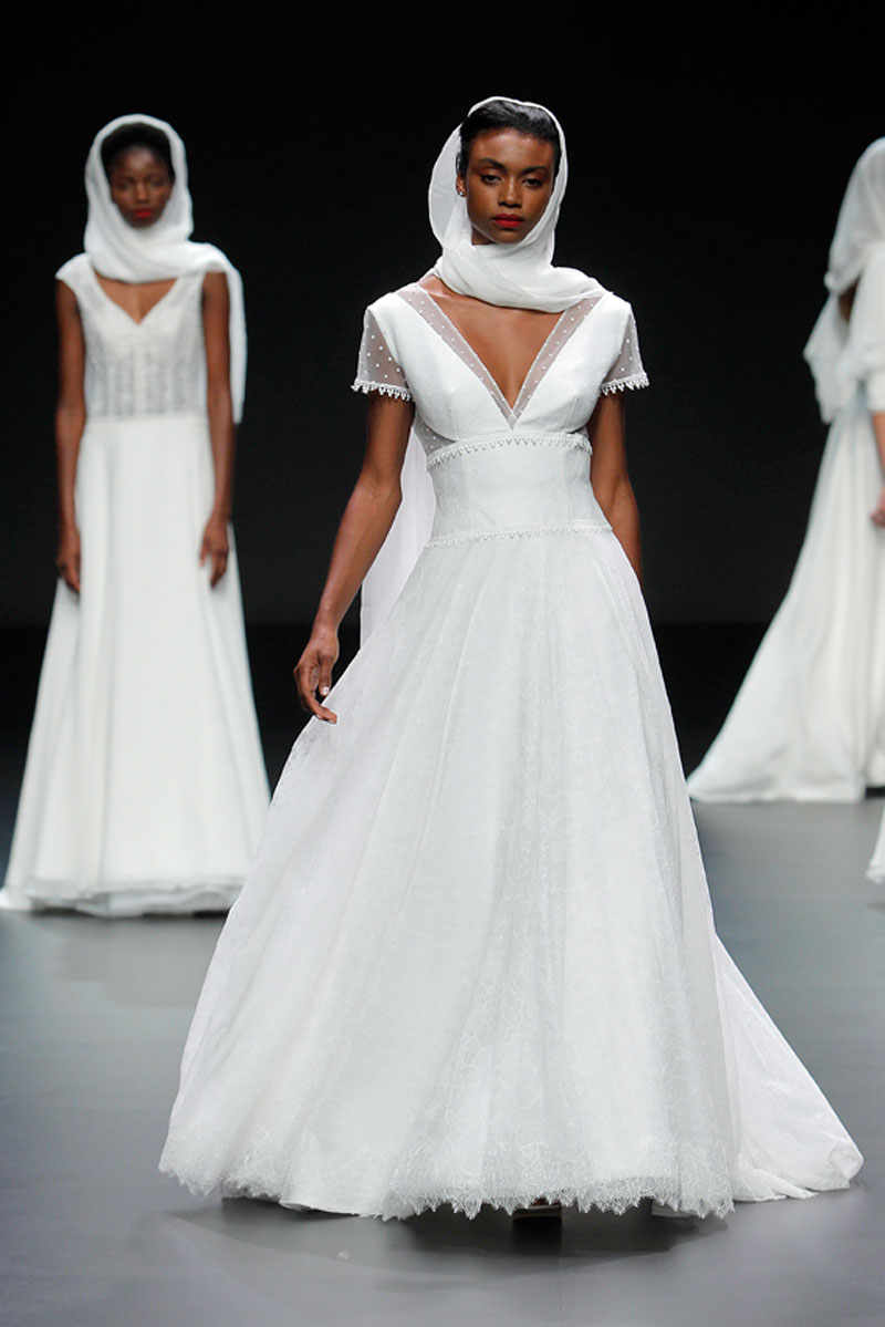 A Haute Couture revela-se através do recurso a fios brilhantes que conferem uma profundidade subtil a materiais como a organza, o tafetá e a renda.