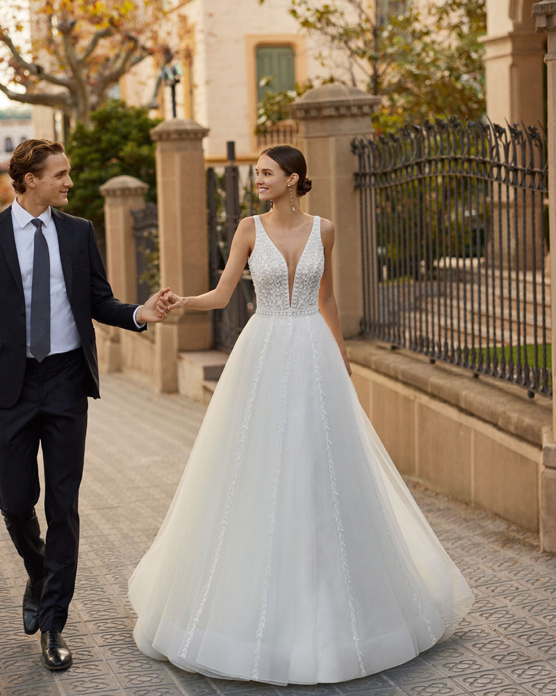 Fiel ao seu nome, a noiva AIRE DIAMOND está destinada a brilhar com vestidos com CORPOS MUITO ELABORADOS com rendas bordadas, aplicações e pedras que conferem luxo e refinamento. A assinatura propõe combiná-los com saias leves de georgette com sensuais aberturas, bem como com saias princesa de tule para um look de sonho. A versão mais urbana apresenta-se em silhueta reta com saia de crepe e um corpo com aplicações que procura a saia, com um efeito que estiliza o corte e oferece uma imagem muito cuidada e atual. |