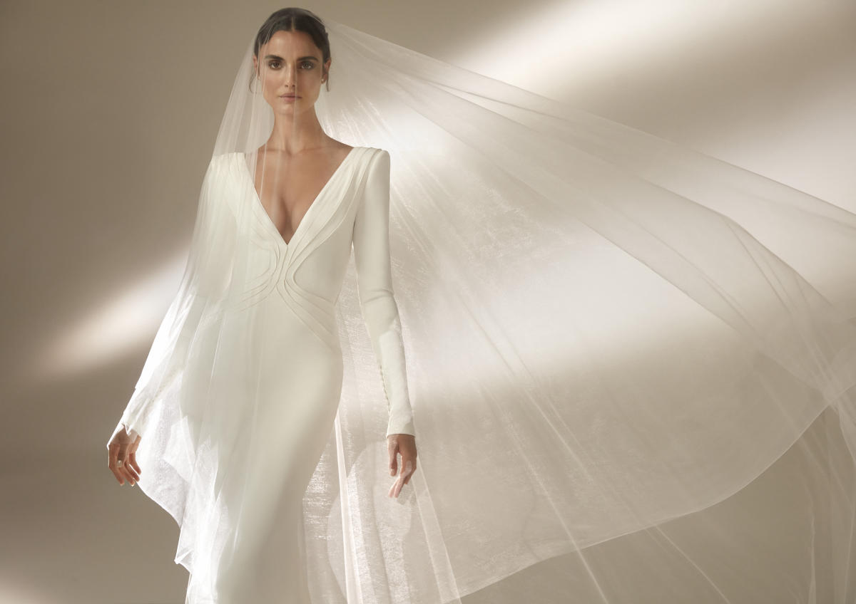 A coleção Pronovias 2021 pode ser definida em três palavras: pregas, mangas, joias.