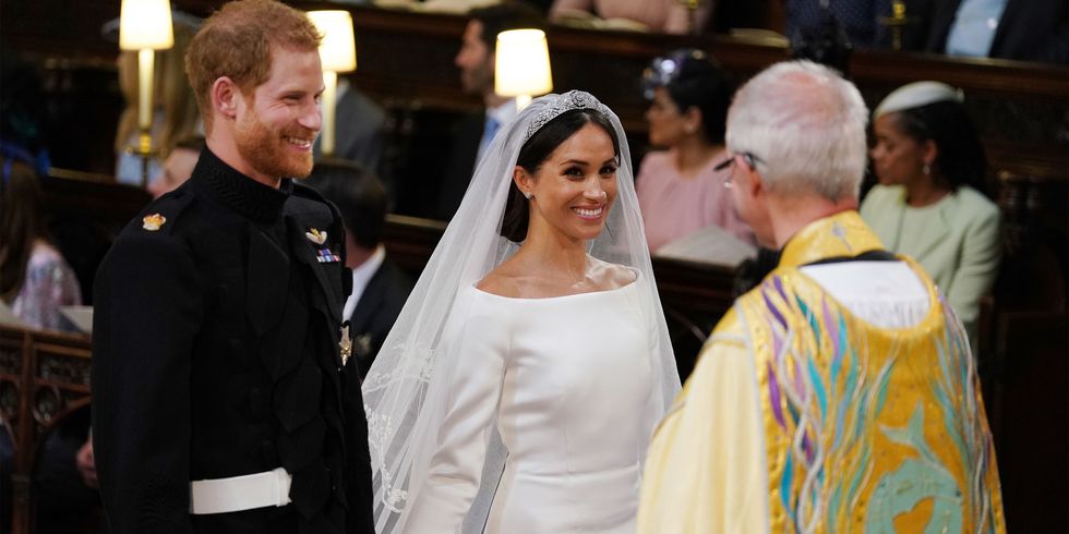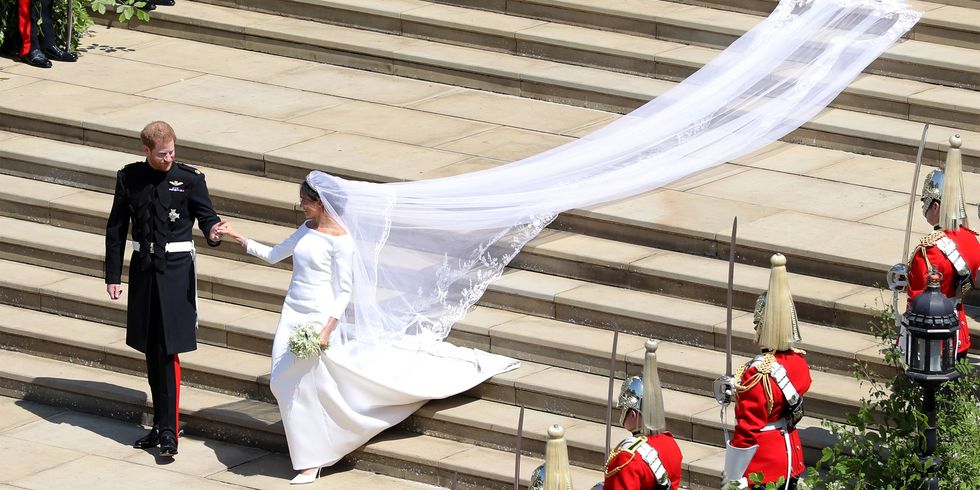 O modelo minimalista era composto por um decote de barco, mangas de 3/4 e um véu com quase cinco metros (onde estavam representados os cinquenta e três países da Commonwealth). Meghan usou, ainda, uma tiara de diamantes emprestada pela Rainha Elizabeth II.