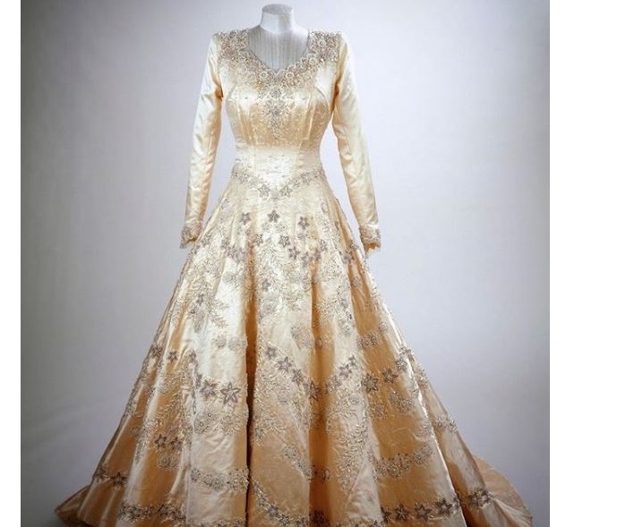 O vestido de noiva foi feito pelo estilista que já tinha vestido a Rainha Elizabeth II no dia do seu casamento, Norman Hartnell.