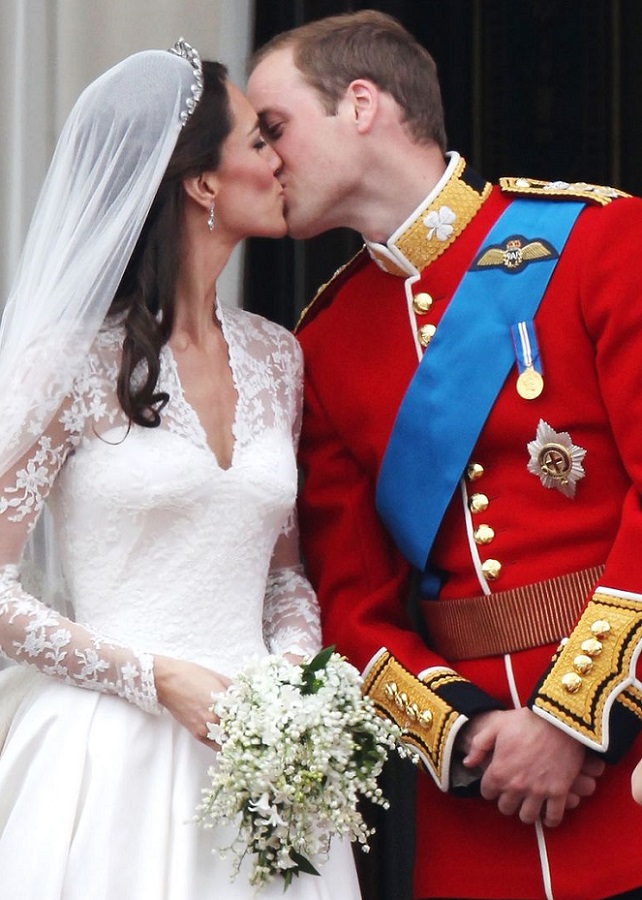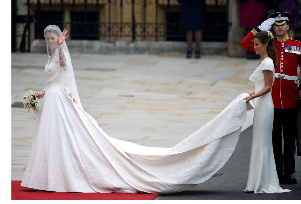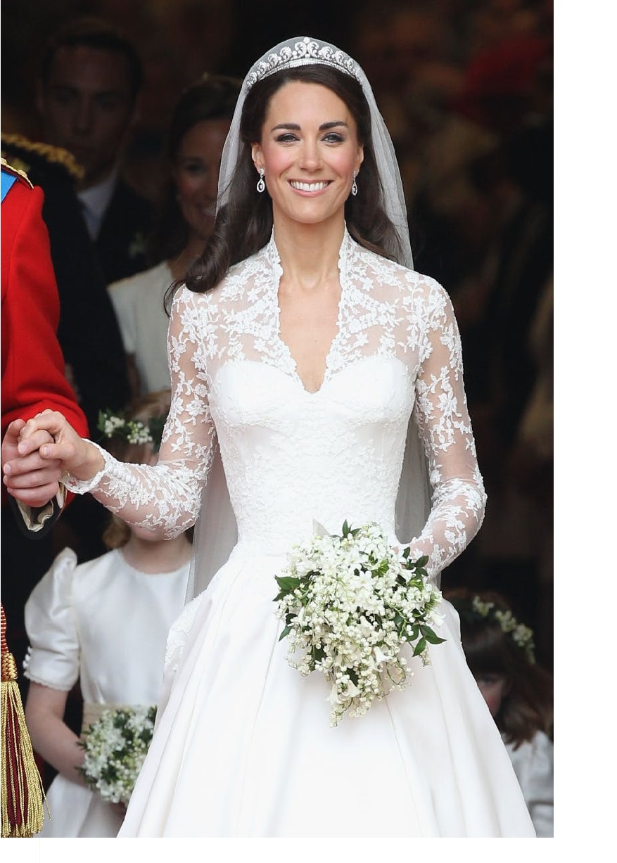 O vestido da noiva foi confecionado pela estilista Sarah Burton, da marca inglesa Alexander McQueen, combinando a tradição e a modernidade num modelo único.