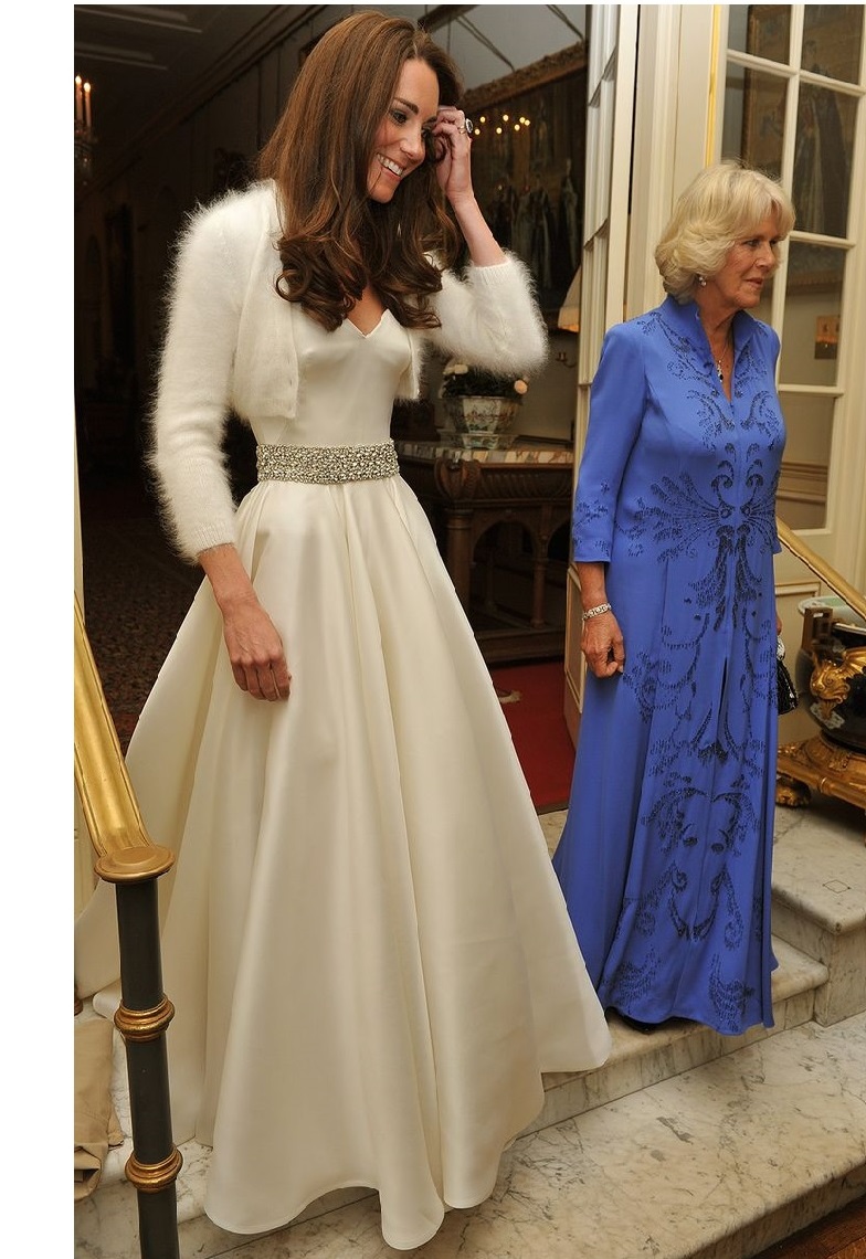 | Kate usou, ainda, um segundo vestido para o copo d´água. O modelo teve, também, a assinatura Alexander McQueen e caracterizou-se pela ausência de alças, assim como pelos detalhes na cintura. |
