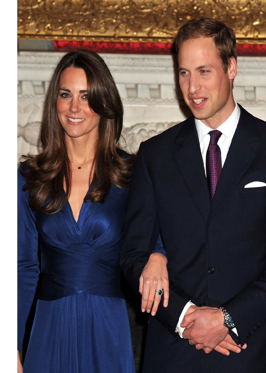 Em abril de 2007, William e Kate separaram-se. No entanto, em junho do mesmo ano, o casal foi visto, novamente junto, em vários eventos sociais. O pedido de casamento aconteceu em 2010, durante uma viagem de dez dias ao Lewa Wildlife Conservancy (um Santuário de Vida Selvagem), no Quénia. O famoso anel de safira e diamantes oferecido pelo Príncipe a Kate pertencia à mãe, Diana Spencer. |
