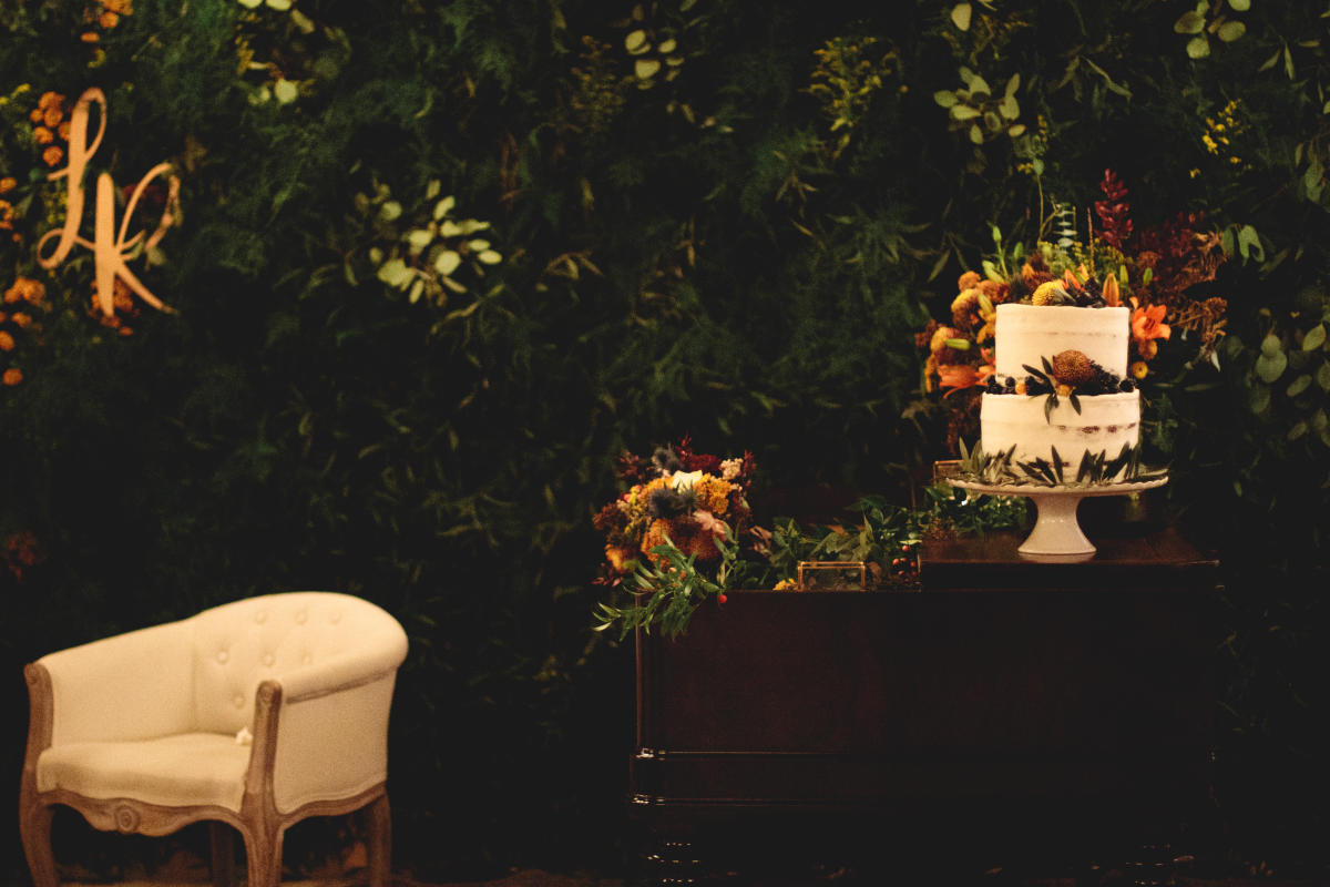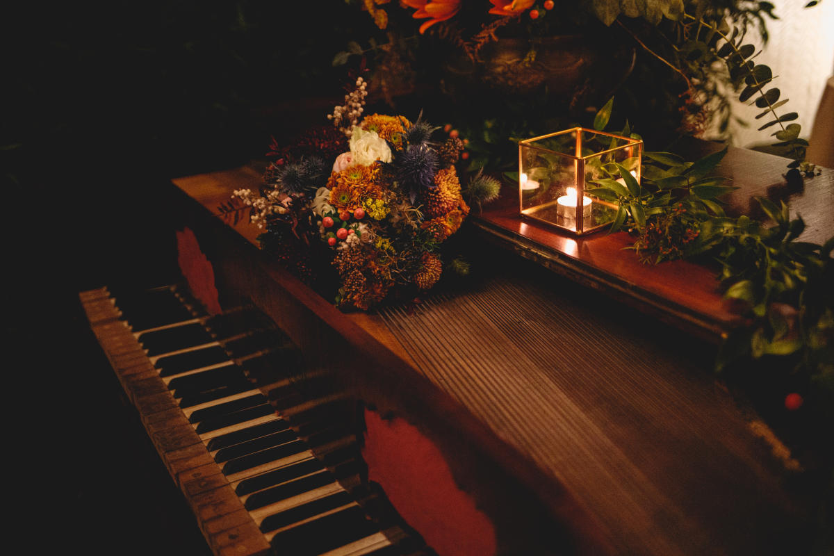 O piano Cravo é da avó e foi recuperado para usar como “mesa do bolo”. A estola de pele de raposa albina pertence ao acervo da família há bastantes anos.