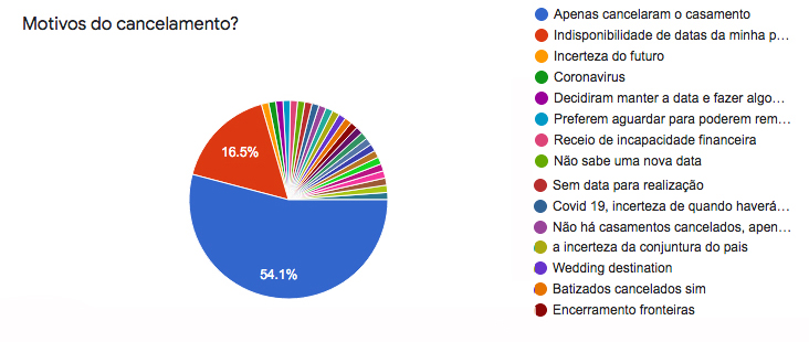 Quanto aos cancelamentos, os motivos variam bastante. Desde o receio da incapacidade financeira, passando pela indisponibilidade de datas, até ao encerramento das fronteiras, são várias as razões que levam os noivos a optarem pelo cancelamento do dia mais importante das suas vidas.
