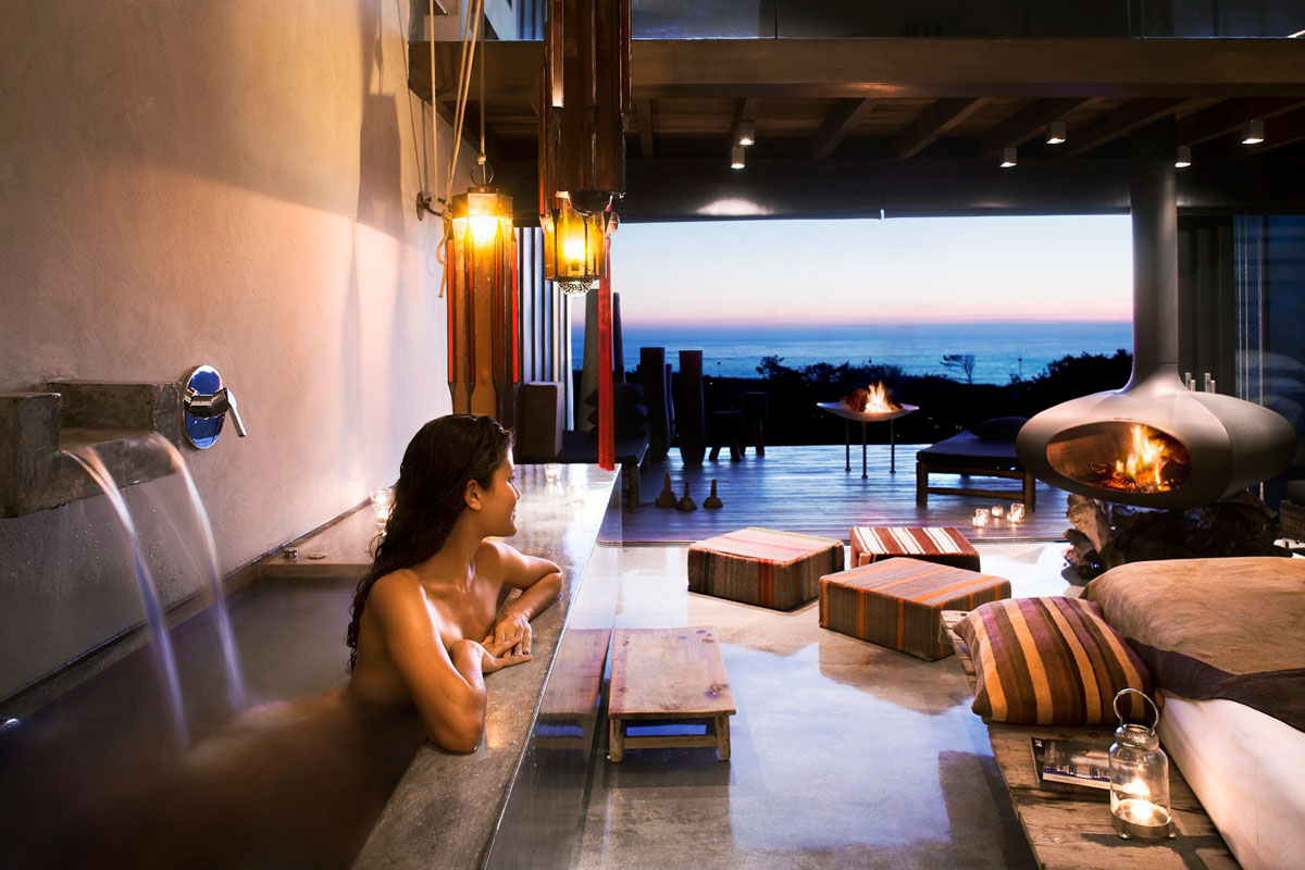 Todos os quartos têm lareira, terraço em deck e zona de banho composta por chuveiros altos que dão a sensação de chuva a cair; várias das habitações têm banheira jacuzzi.