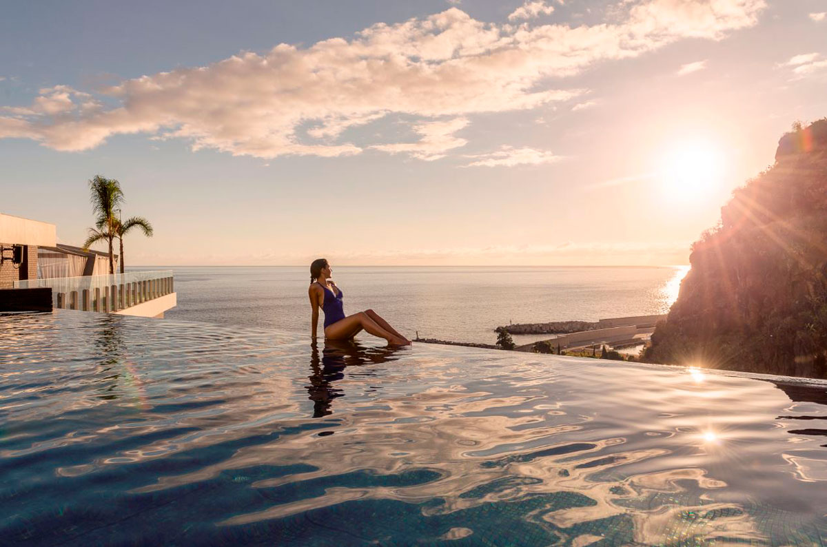 As duas encantadoras piscinas de água aquecida, a piscina sobre o mar e o solário que se estende sobre as rochas contam com vistas infindáveis sobre o Oceano Atlântico.