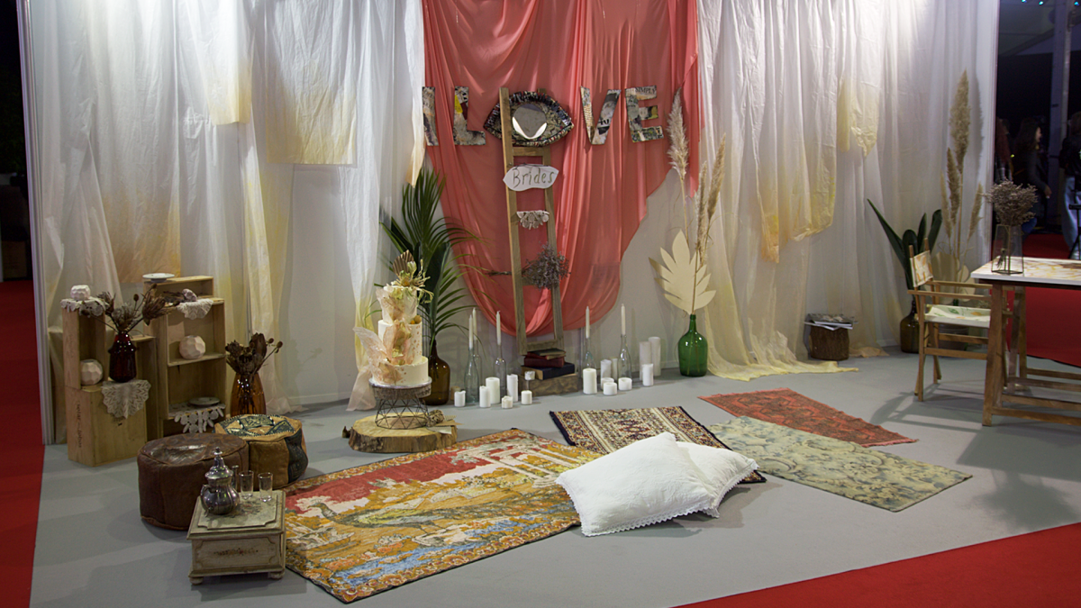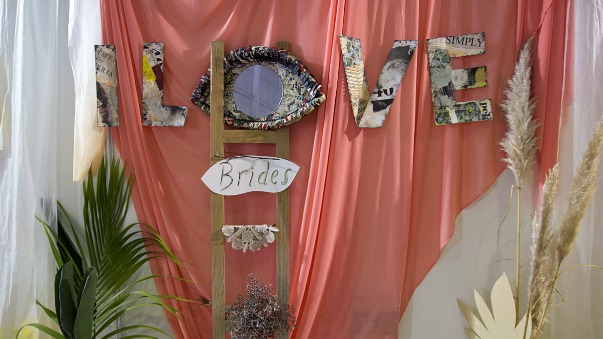 "Criámos uma proposta conceptual para a decoração do stand I LOVE Brides, assente em princípios associados à reciclagem e à reutilização. Como tal, recorremos a materiais usados e pintámos-los: as letras da palavra “I LOVE BRIDES” foram feitas à mão, com colagens e pintura; a letra "O" está representada por um "espelho olho", construído manualmente com pasta de papel e com colagens de jornais e revistas usadas.