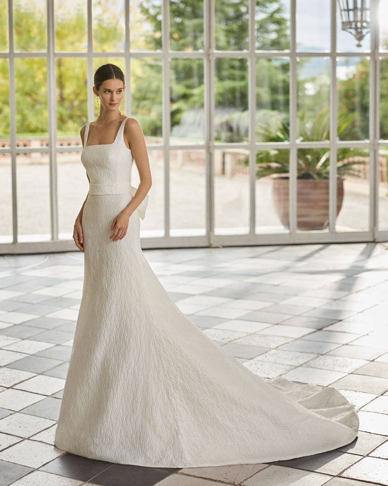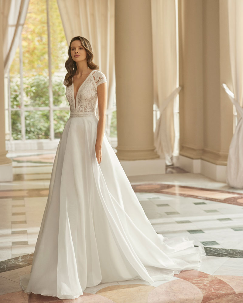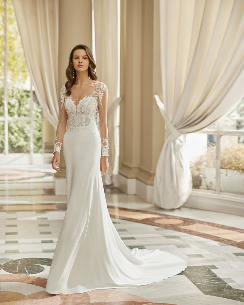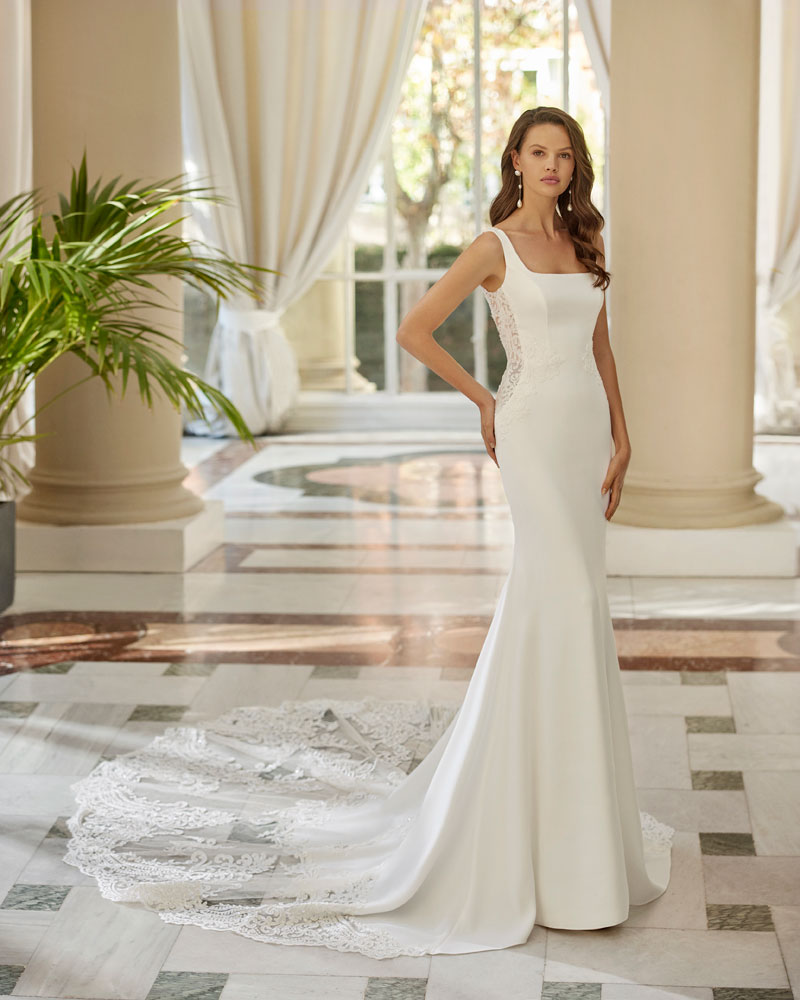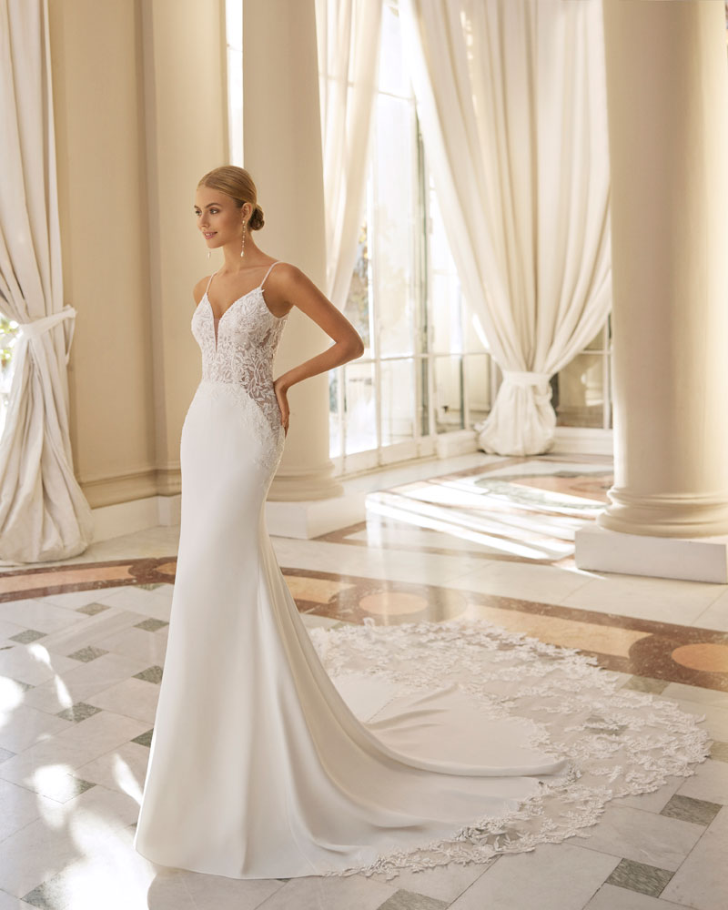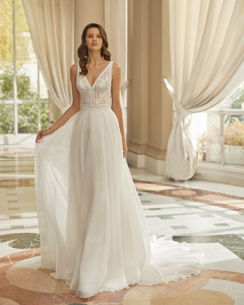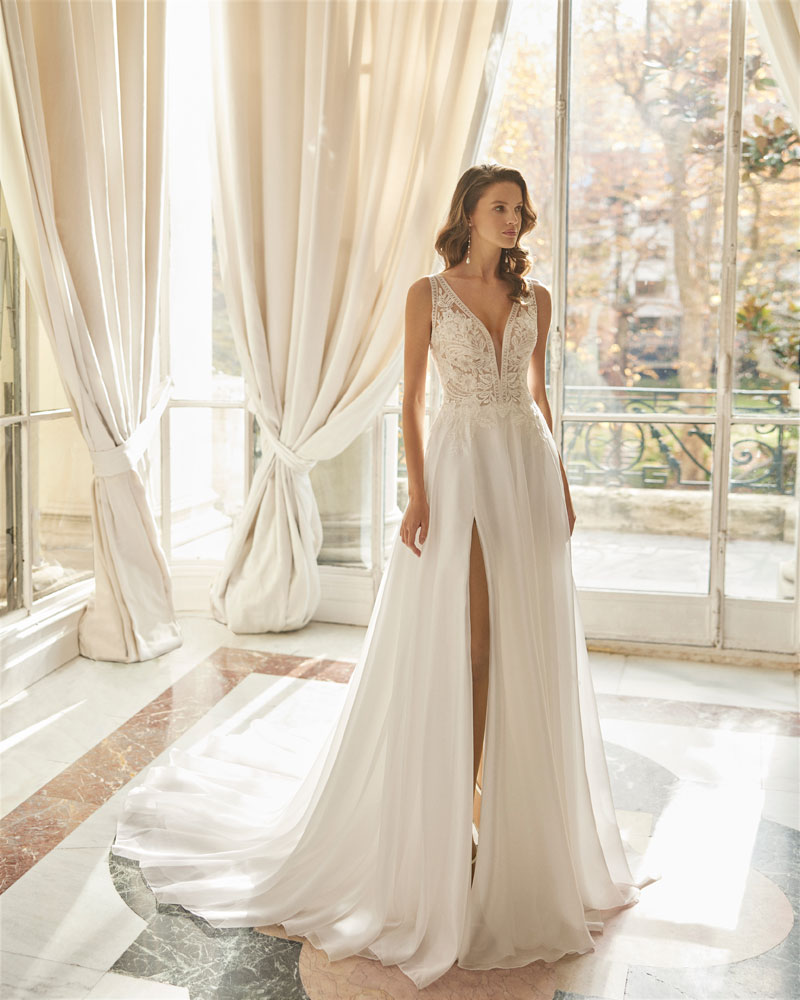 A coleção 2023 de AIRE BARCELONA combina sensualidade e sobriedade de linhas com mestria. A tendência dos VESTIDOS LISOS interpreta-se com designs retos em crepe elástico ou georgette que jogam com bainhas italianas em corpos e saias, para desenhar a silhueta e estilizar as curvas. Em alguns casos, adornam-se com delicadas incrustações de renda para definir o corte ou decorar mangas ligeiramente abalonadas para um toque de romantismo subtil. Para brilhar com elegância, a assinatura propõe vestidos de linha reta ou princesa com elaborados CORPOS DE RENDA e diversas pedrarias que conferem sofisticação. Ou os novos designs com SAIAS CAPA DE ORGANZA e corpos de renda, num look em alta entre as noivas jovens pela sua fluidez e comodidade.