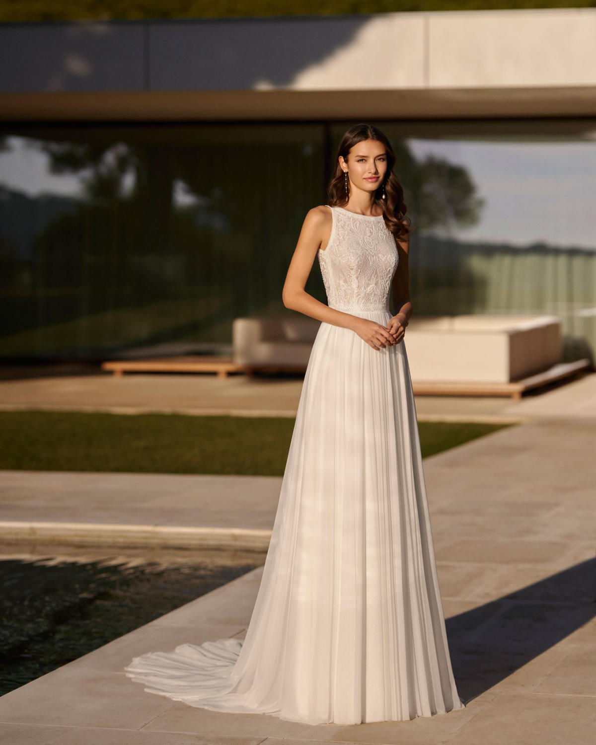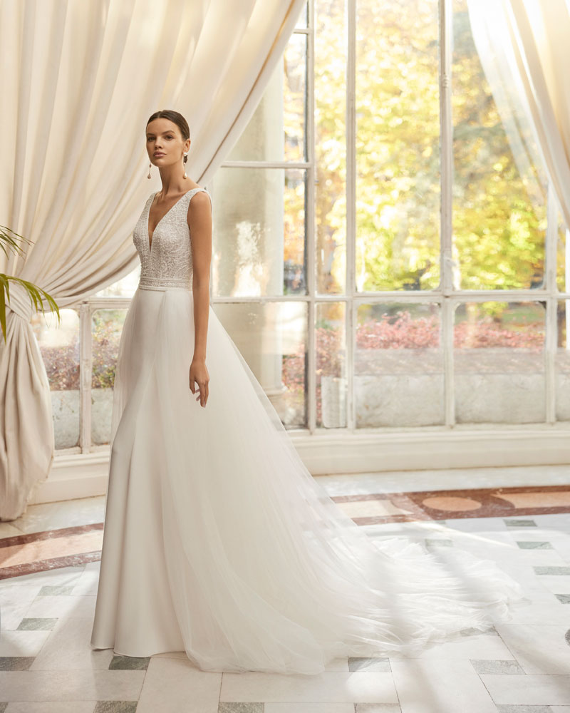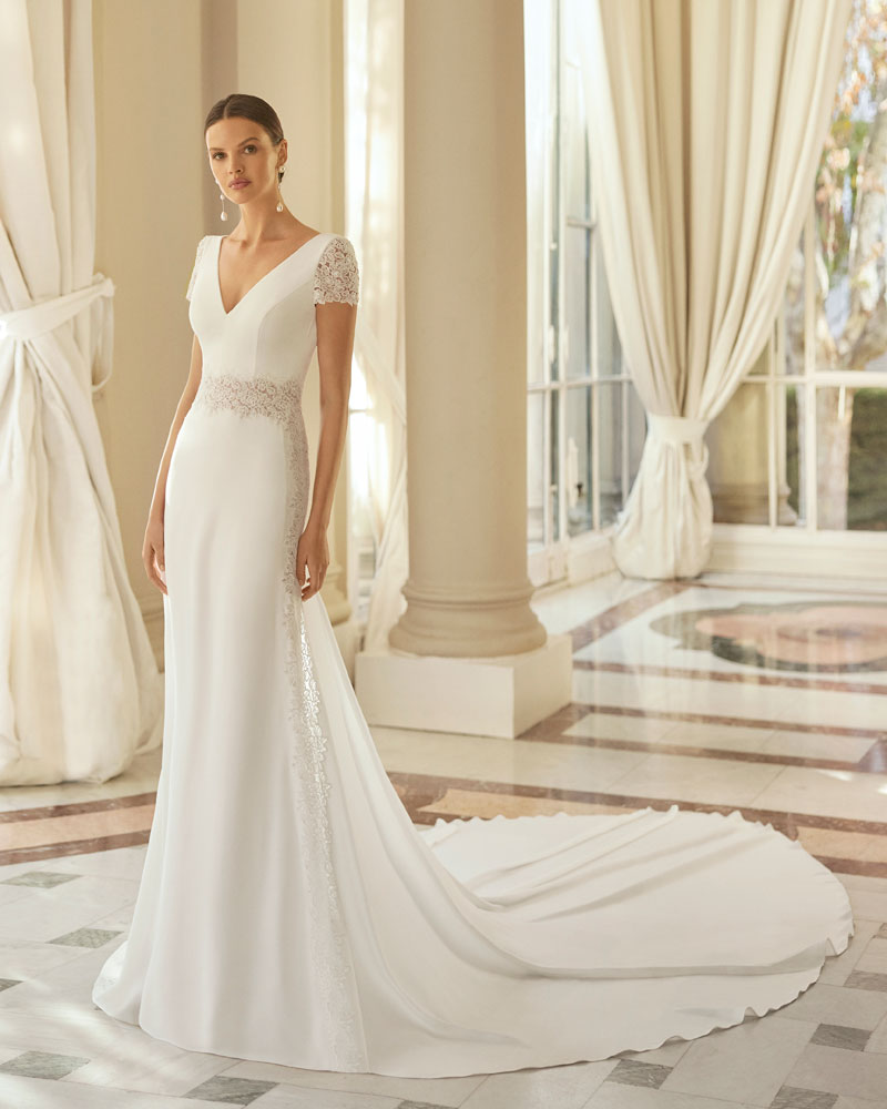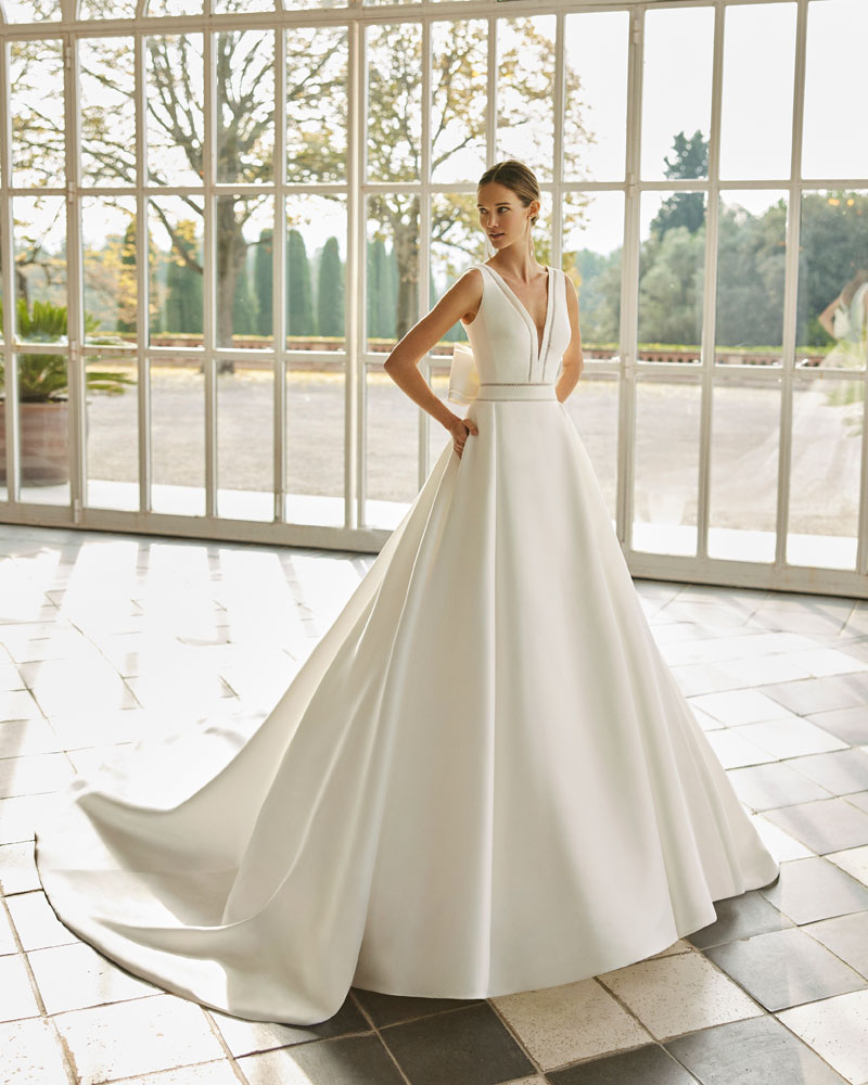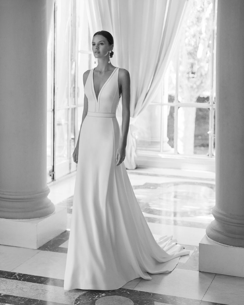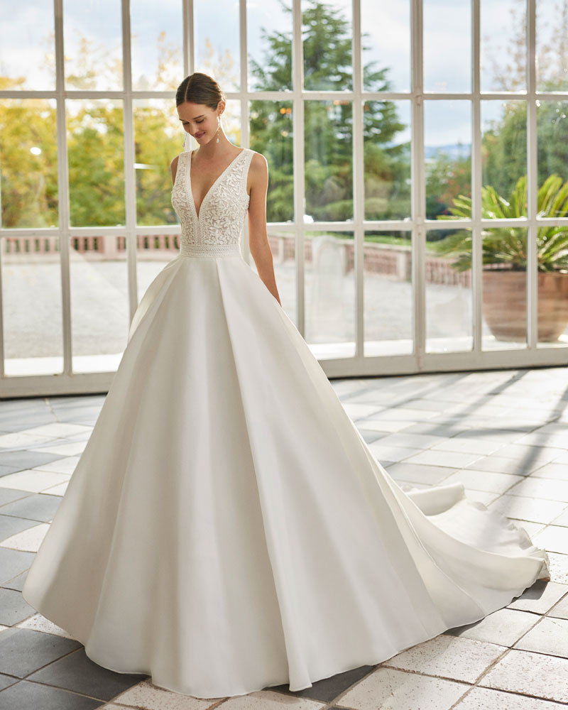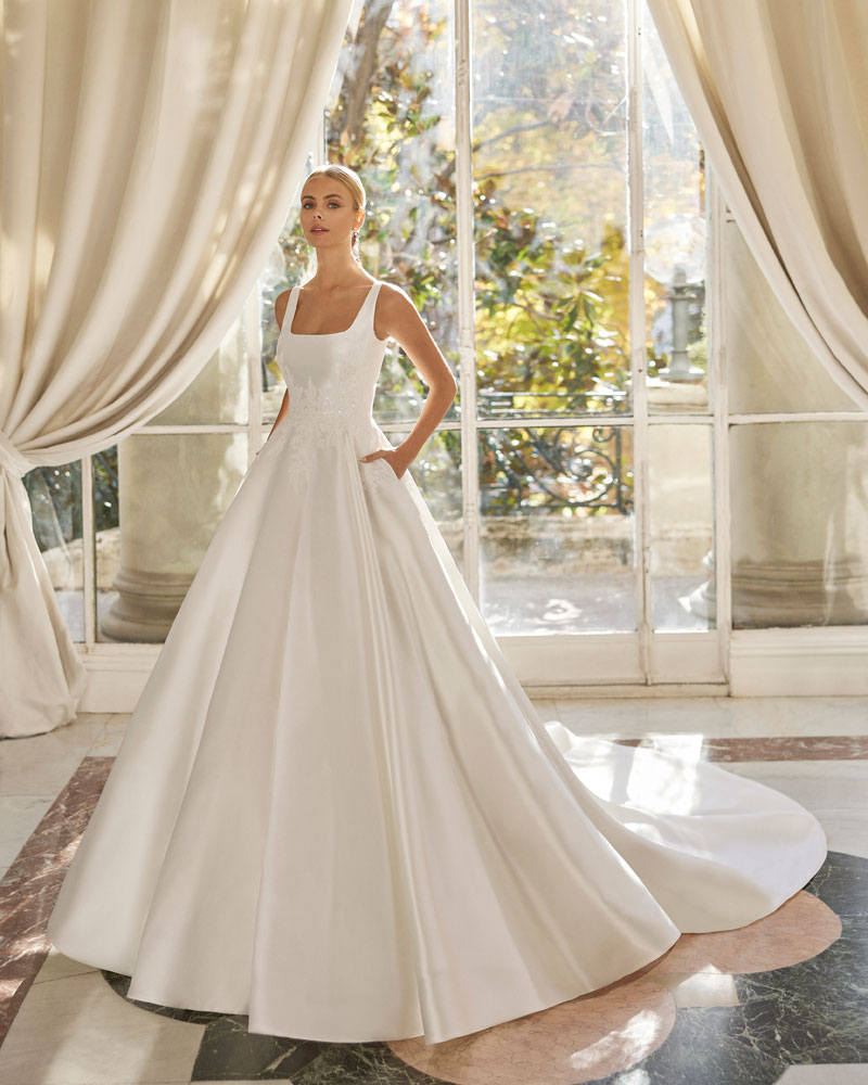 A coleção 2023 de AIRE BARCELONA combina sensualidade e sobriedade de linhas com mestria. A tendência dos VESTIDOS LISOS interpreta-se com designs retos em crepe elástico ou georgette que jogam com bainhas italianas em corpos e saias, para desenhar a silhueta e estilizar as curvas. Em alguns casos, adornam-se com delicadas incrustações de renda para definir o corte ou decorar mangas ligeiramente abalonadas para um toque de romantismo subtil. Para brilhar com elegância, a assinatura propõe vestidos de linha reta ou princesa com elaborados CORPOS DE RENDA e diversas pedrarias que conferem sofisticação. Ou os novos designs com SAIAS CAPA DE ORGANZA e corpos de renda, num look em alta entre as noivas jovens pela sua fluidez e comodidade.