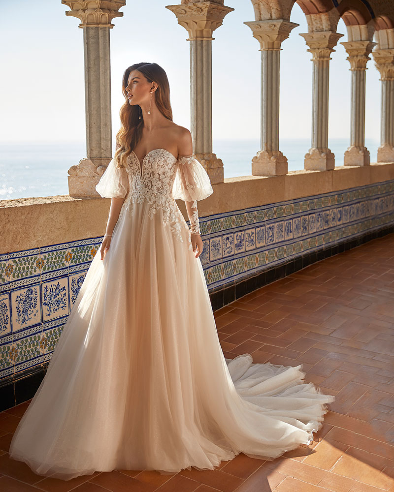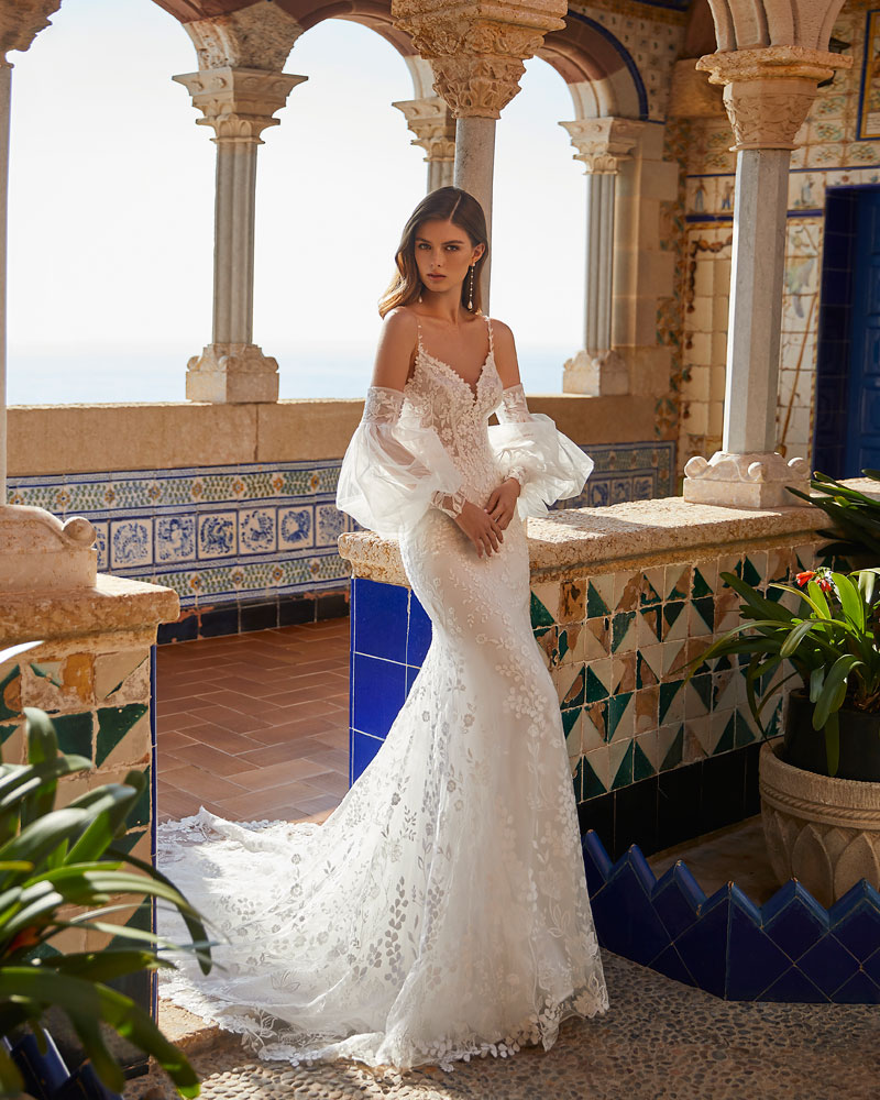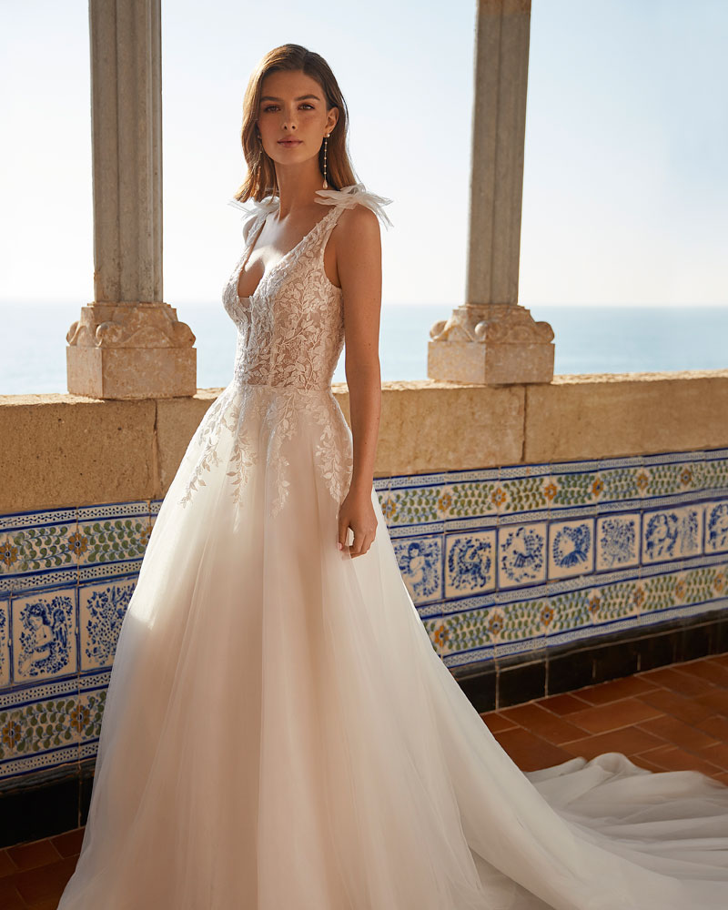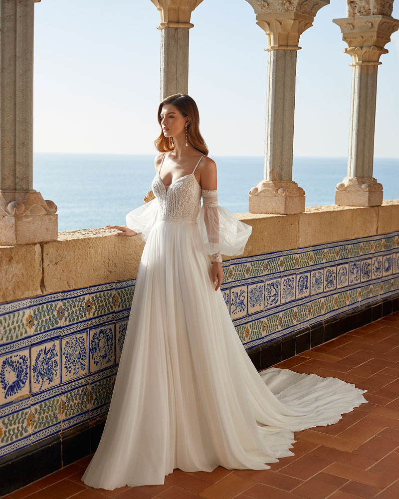 Designs fluidos e etéreos de inspiração mediterrânica definem a nova coleção 2023 AIRE BEACH WEDDING. MUSS, um tecido com aspeto e queda que evoca a gaze, tornou-se um grande protagonista ao dar vida a vestidos vaporosos com saias de aberturas laterais que deixam entrever o delicado chantilly e se combinam com corpos de renda. Outra versão da noiva Aire Beach Wedding é a guardada num delicado vestido sereia de renda e guipur, de aspeto orgânico e tato de algodão, com motivos florais ou geométricos para um look muito sensual que atrai todos os olhares. |