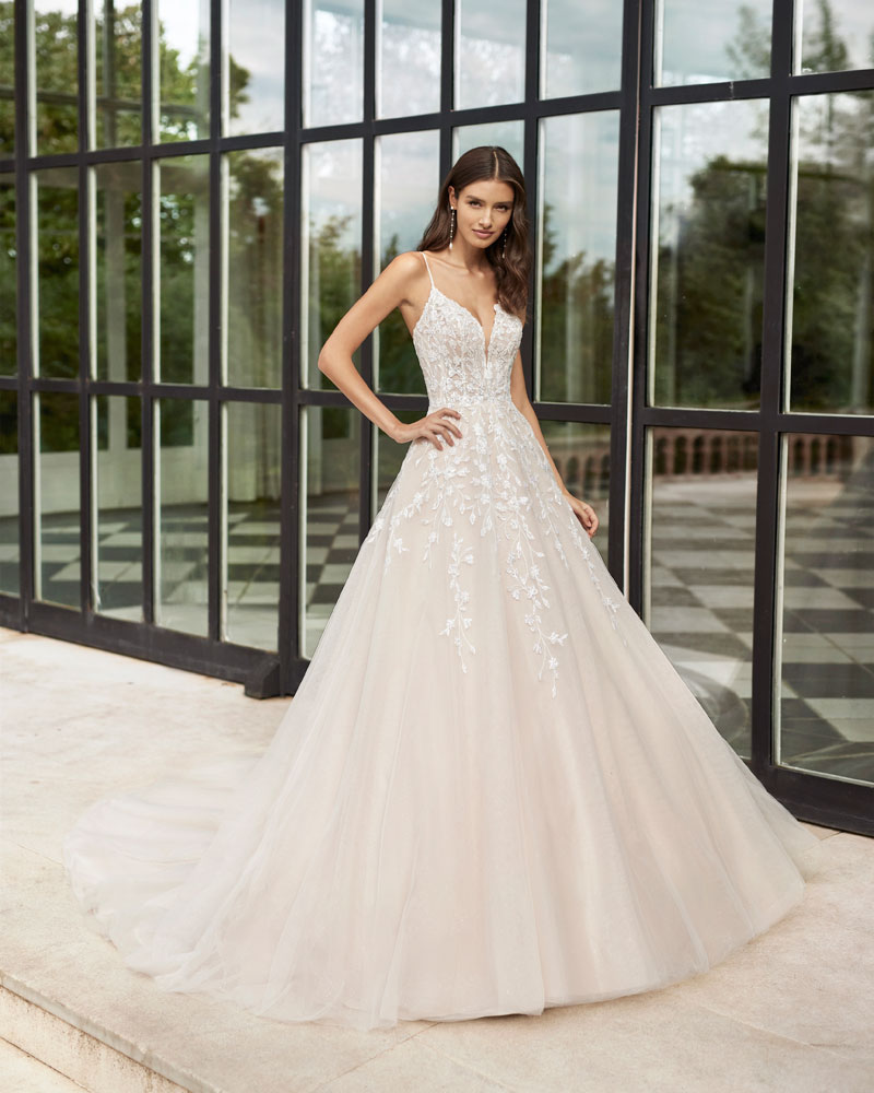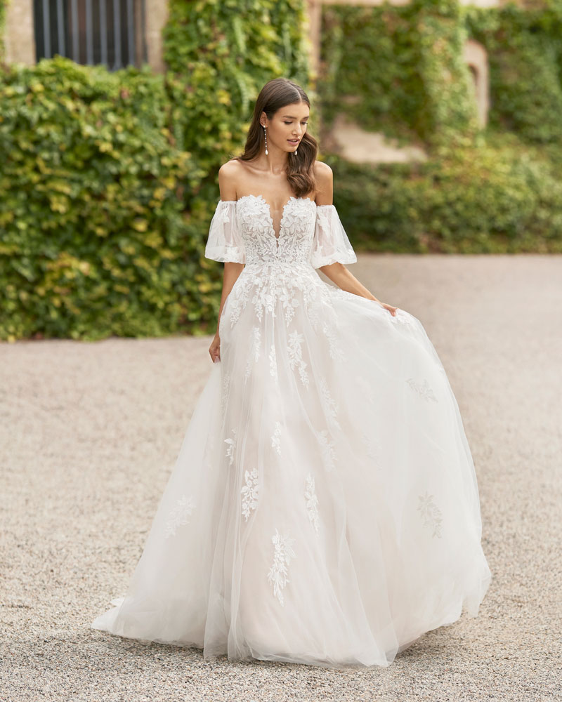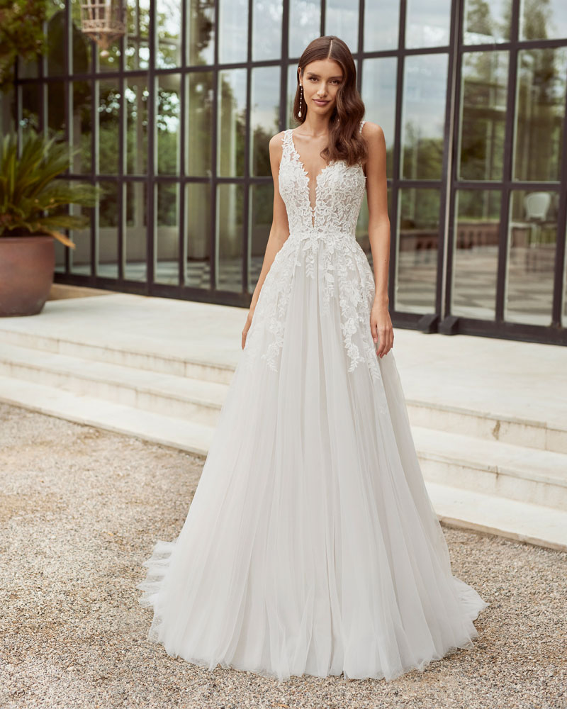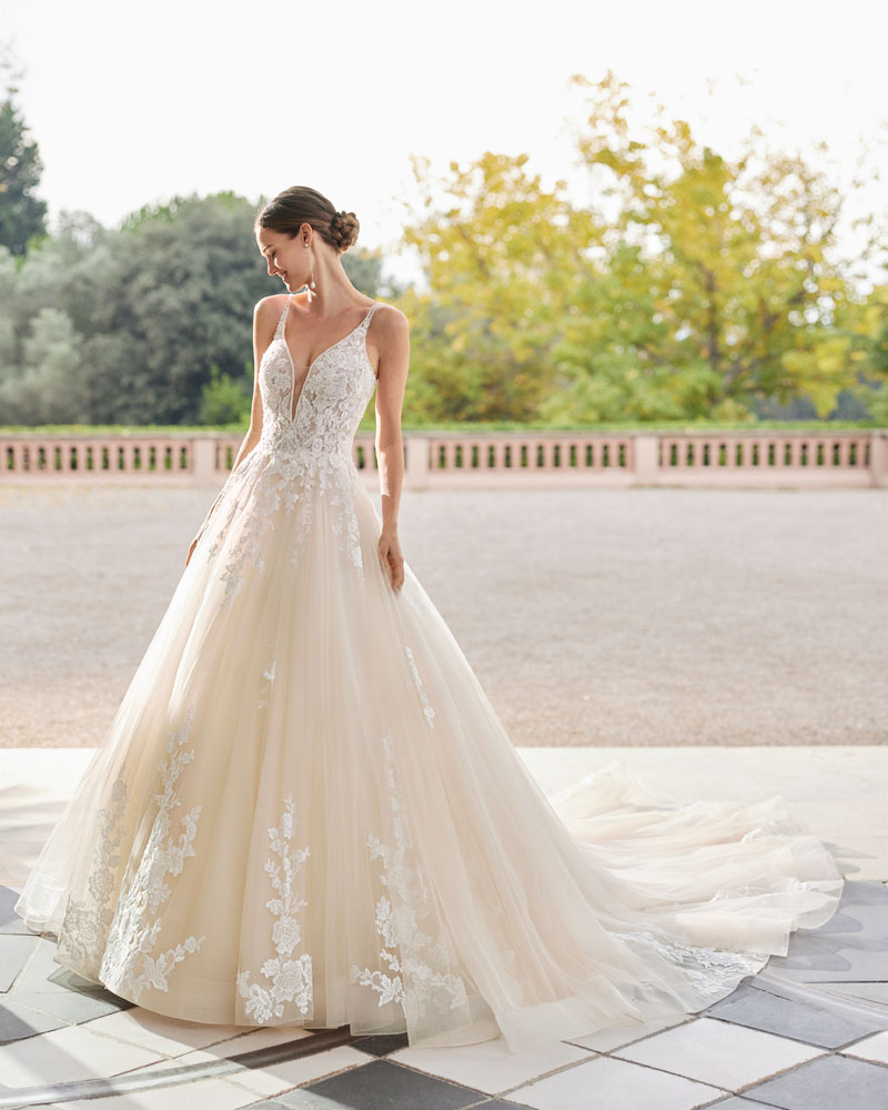 Para a noiva que procura um look romântico, AIRE ROYALE apresenta vestidos de tule muito especial com APLICAÇÕES DE RENDA, com motivos florais que deslizam desde o corpo à saia e criam um efeito relevo espetacular. A assinatura introduz uma pincelada de cor em tons nude, champanhe e pêssego nesta linha de vestidos de indubitável coração romântico. Outra opção são os designs em tecidos de costura como o raso ou o mikado, que permitem criar volumes e SILHUETAS INCRÍVEIS, sejam de sereia ou com volume, jogando com detalhes de costura como as pregas, as laterais e as aplicações de renda. |