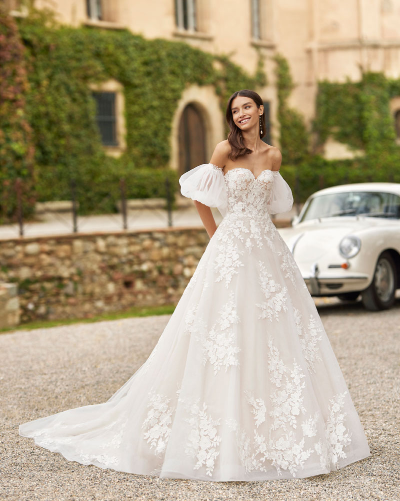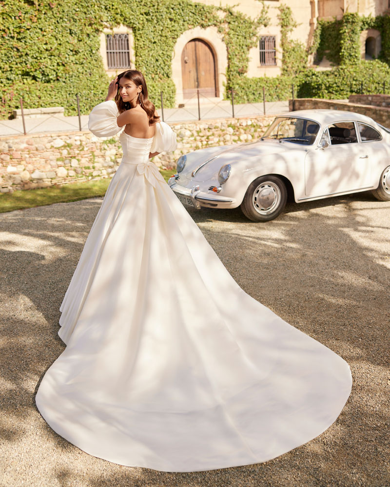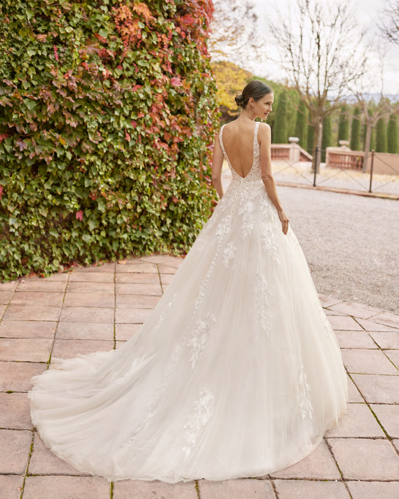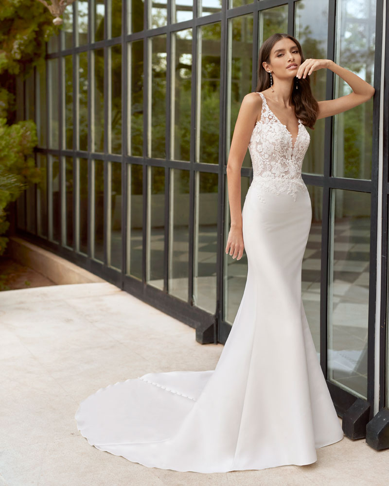 Para a noiva que procura um look romântico, AIRE ROYALE apresenta vestidos de tule muito especial com APLICAÇÕES DE RENDA, com motivos florais que deslizam desde o corpo à saia e criam um efeito relevo espetacular. A assinatura introduz uma pincelada de cor em tons nude, champanhe e pêssego nesta linha de vestidos de indubitável coração romântico. Outra opção são os designs em tecidos de costura como o raso ou o mikado, que permitem criar volumes e SILHUETAS INCRÍVEIS, sejam de sereia ou com volume, jogando com detalhes de costura como as pregas, as laterais e as aplicações de renda. |
