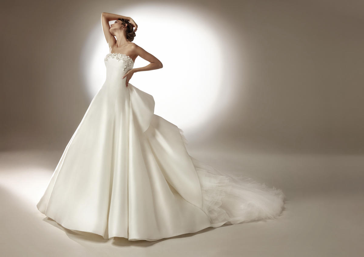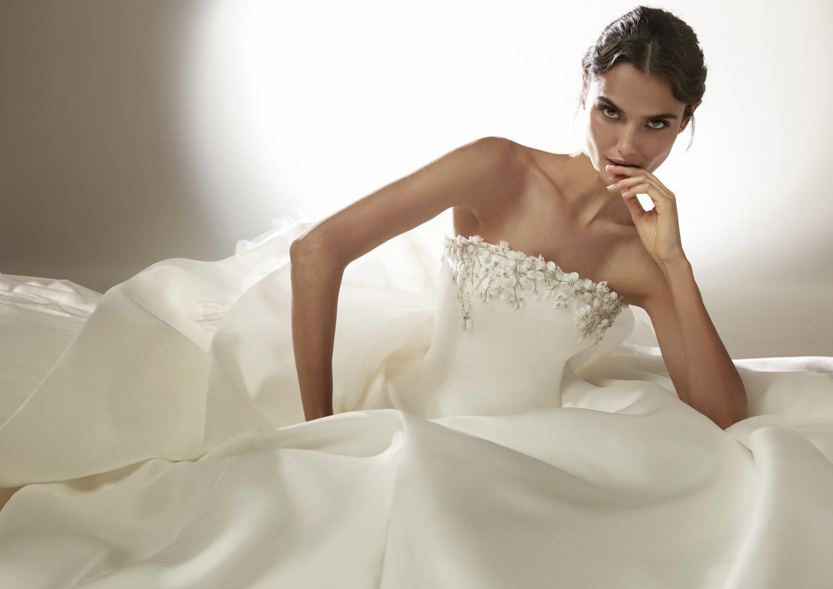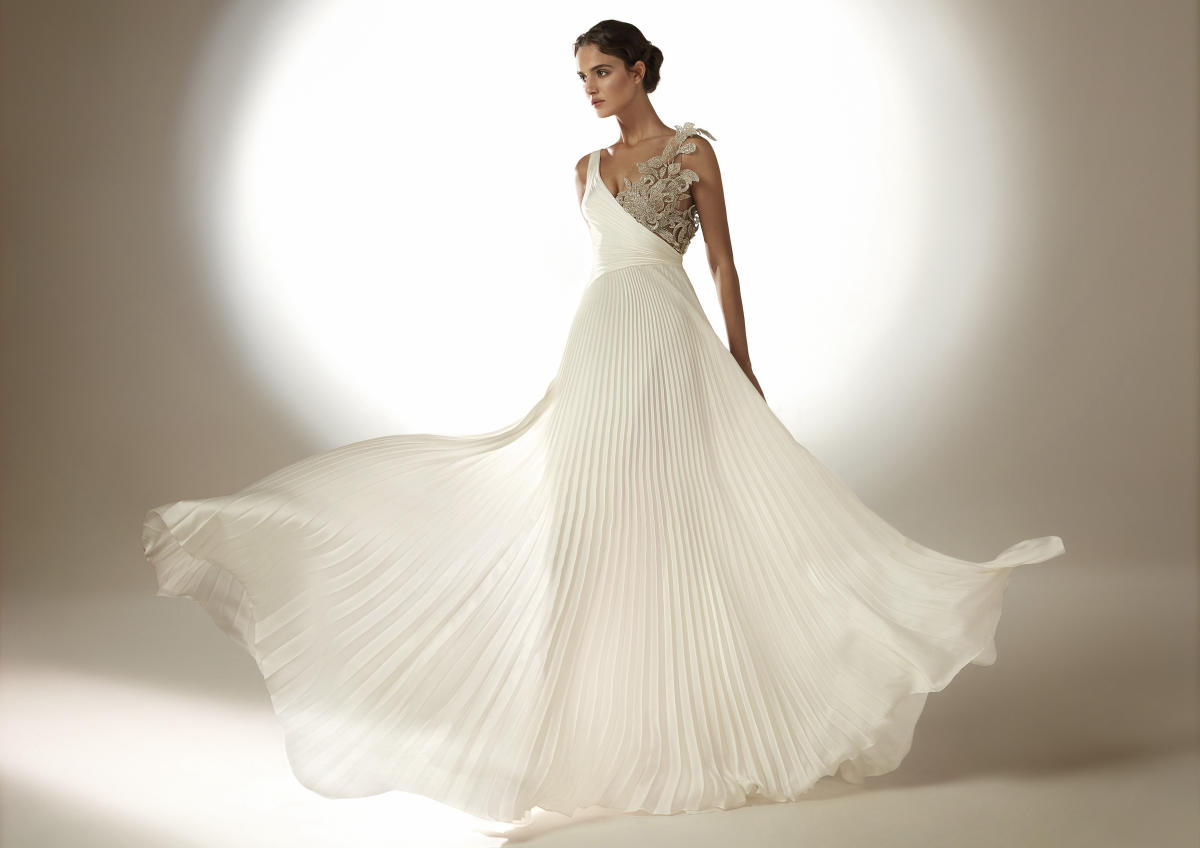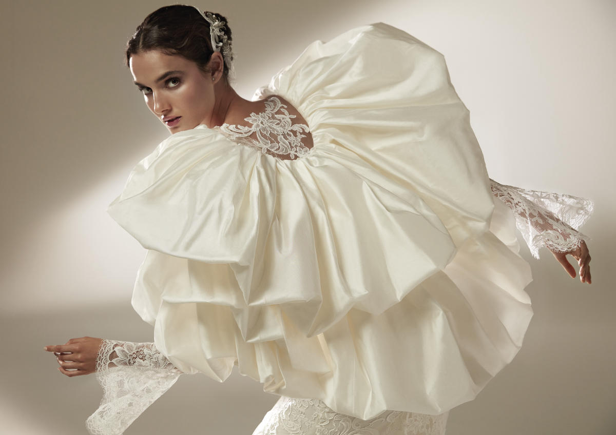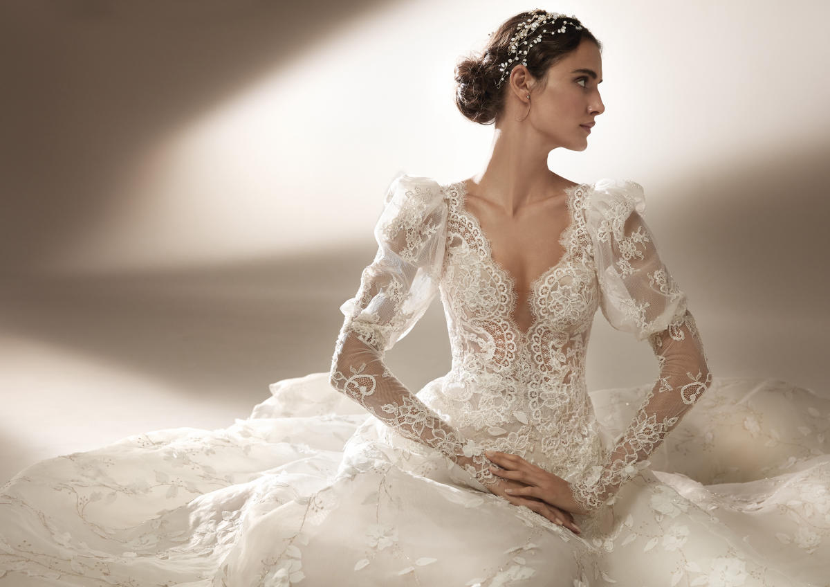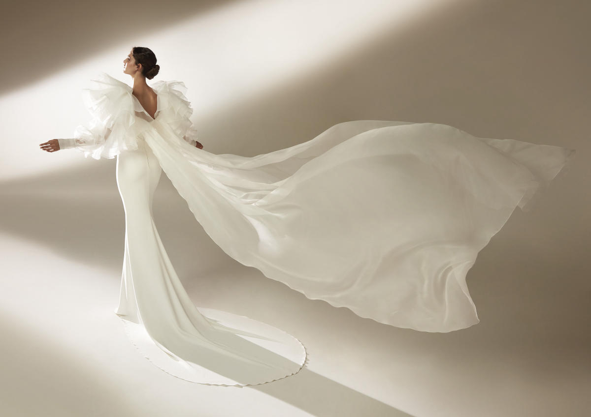A coleção Pronovias 2021 pode ser definida em três palavras: pregas, mangas, joias.