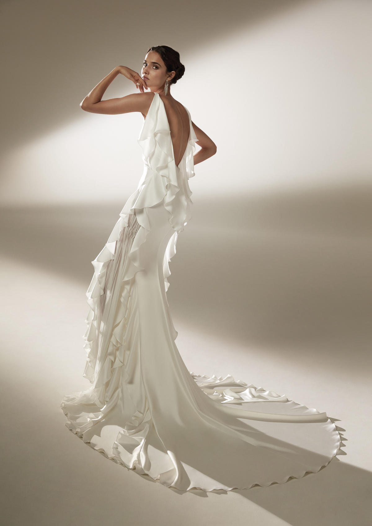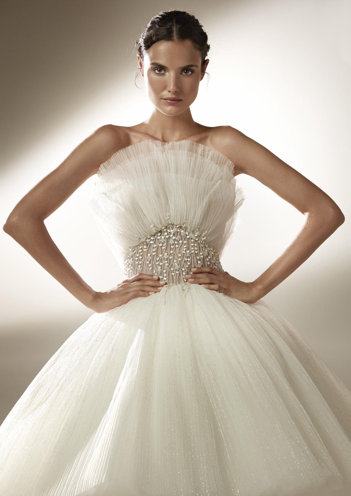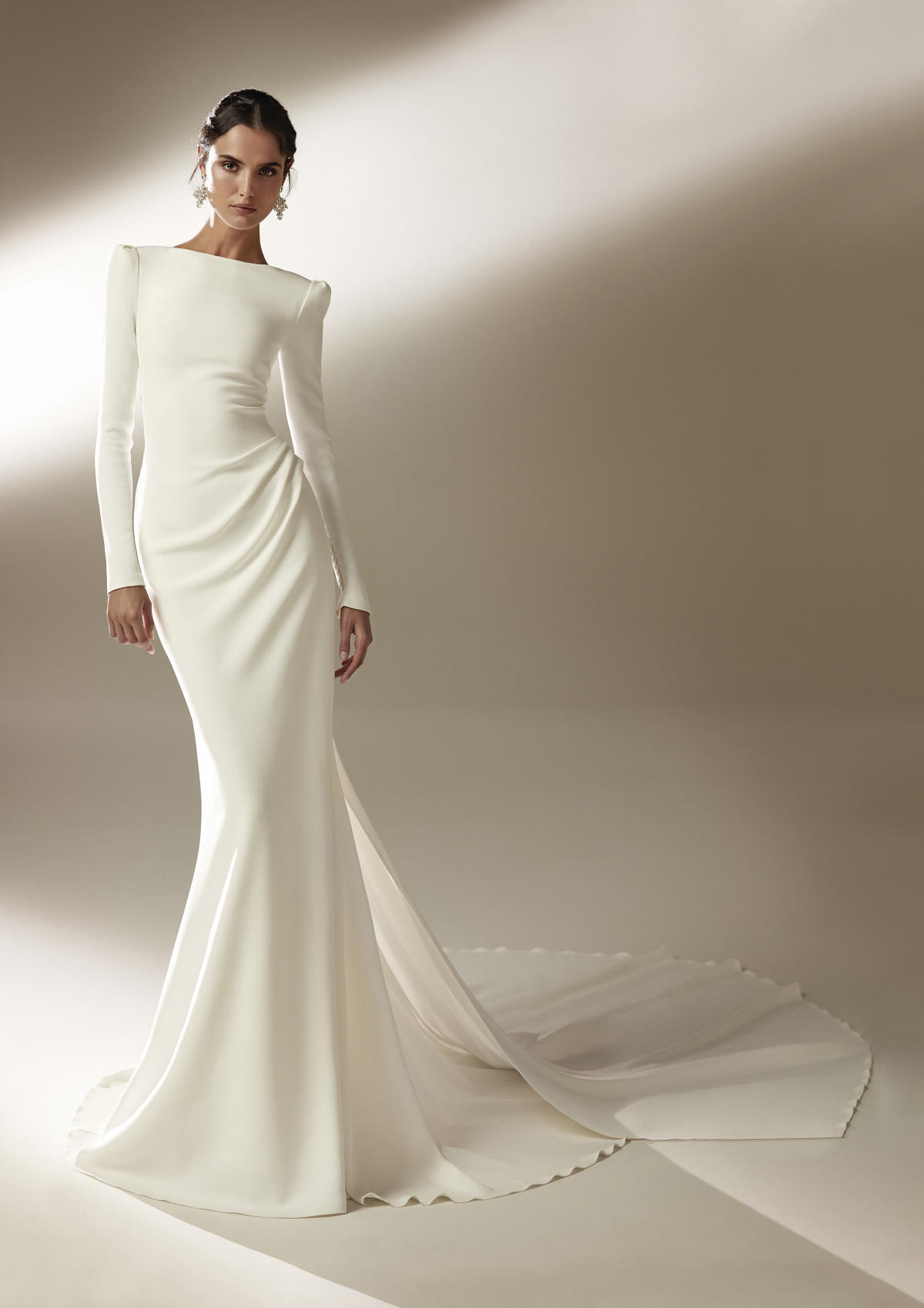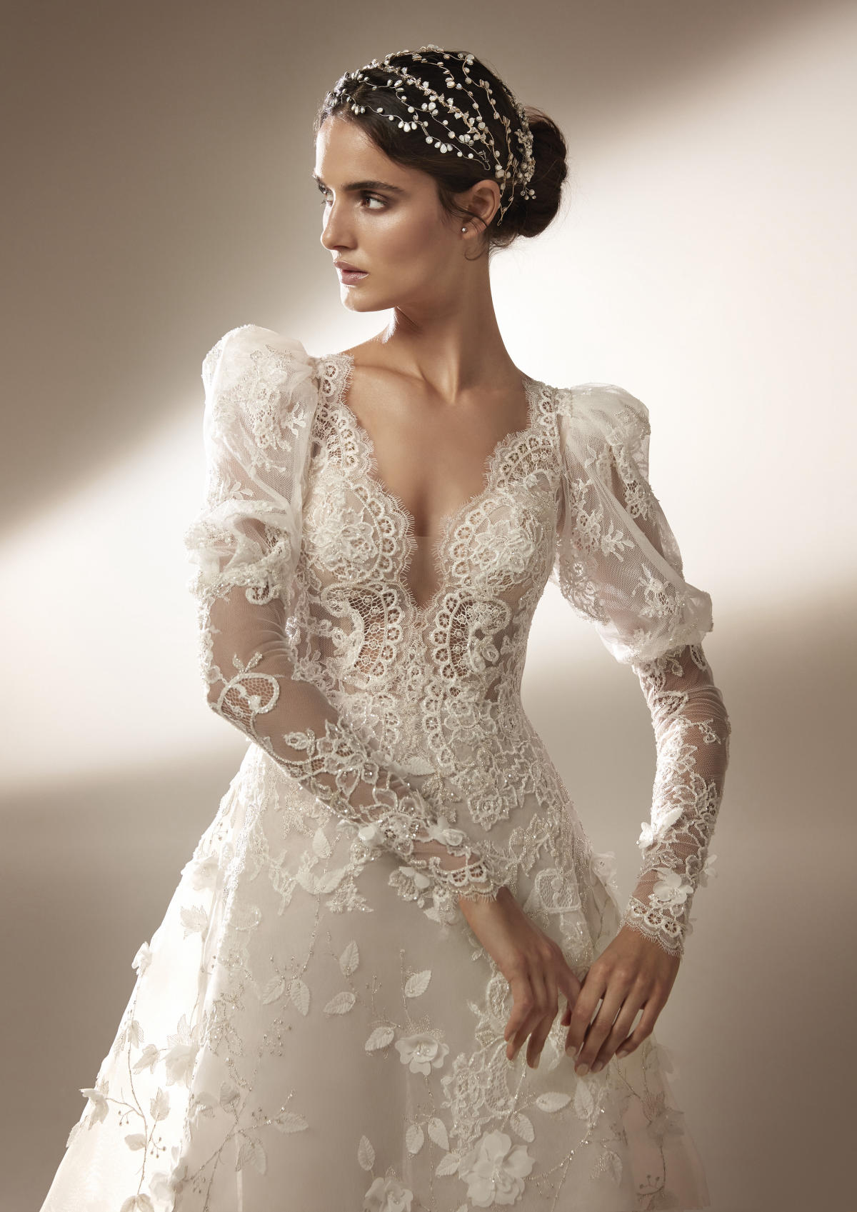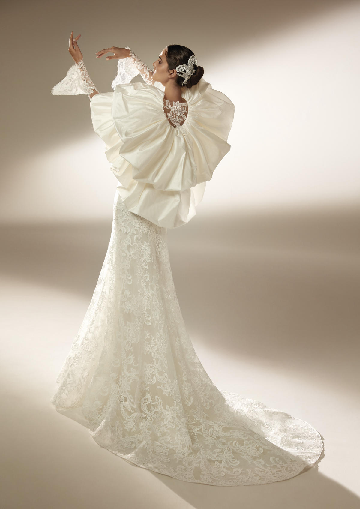 A coleção Pronovias 2021 pode ser definida em três palavras: pregas, mangas, joias.