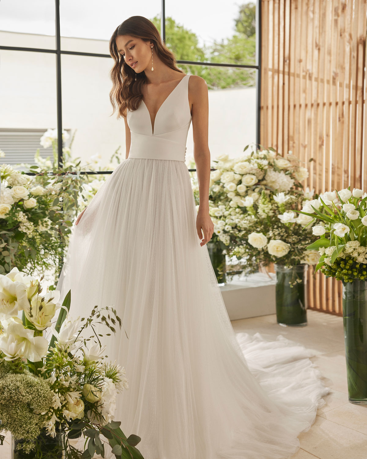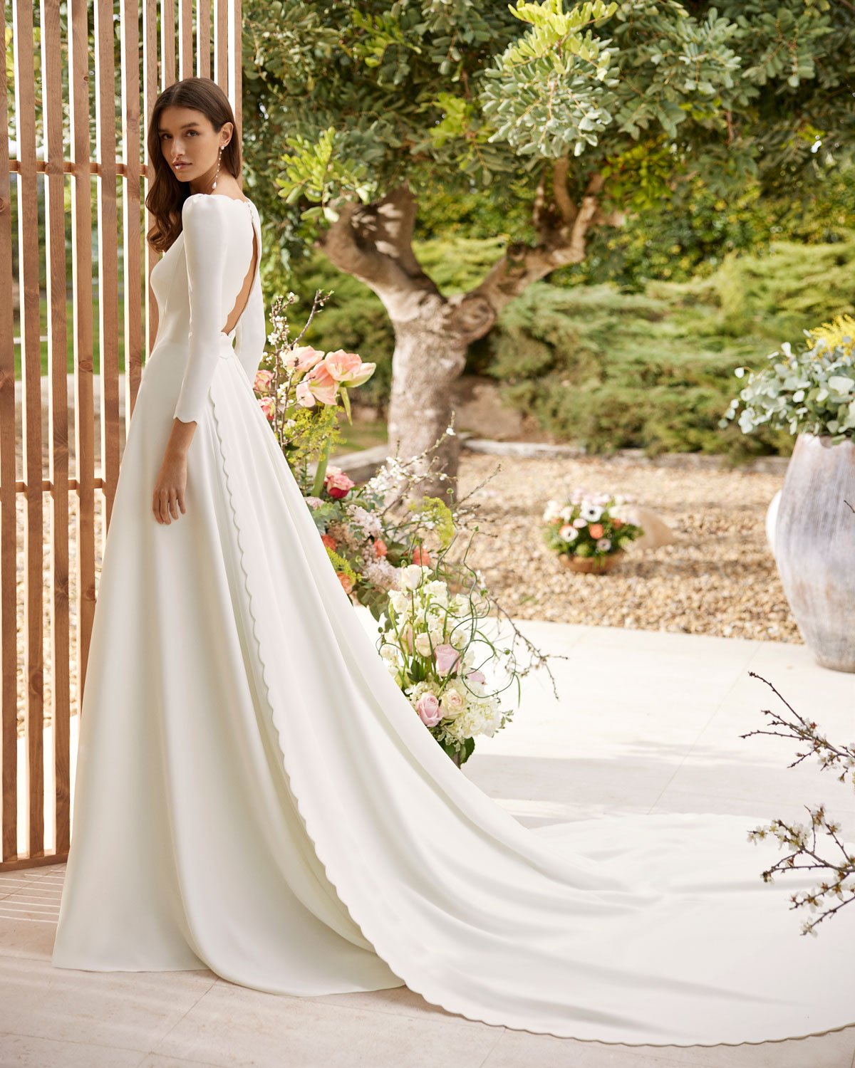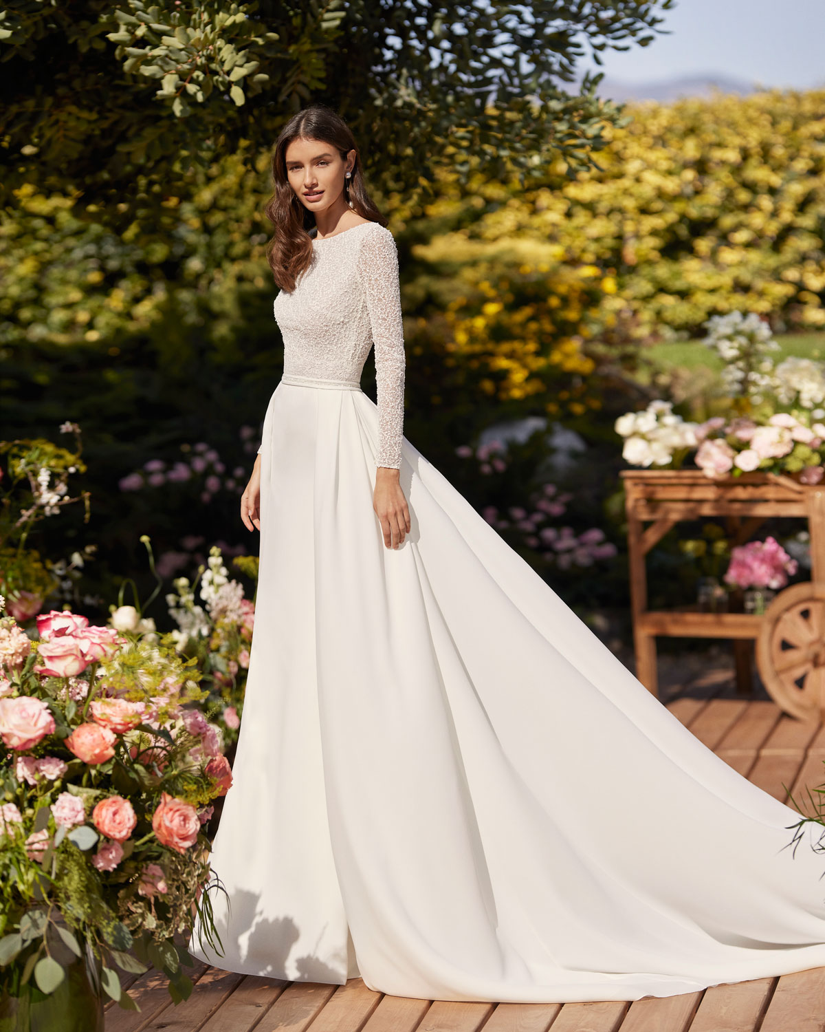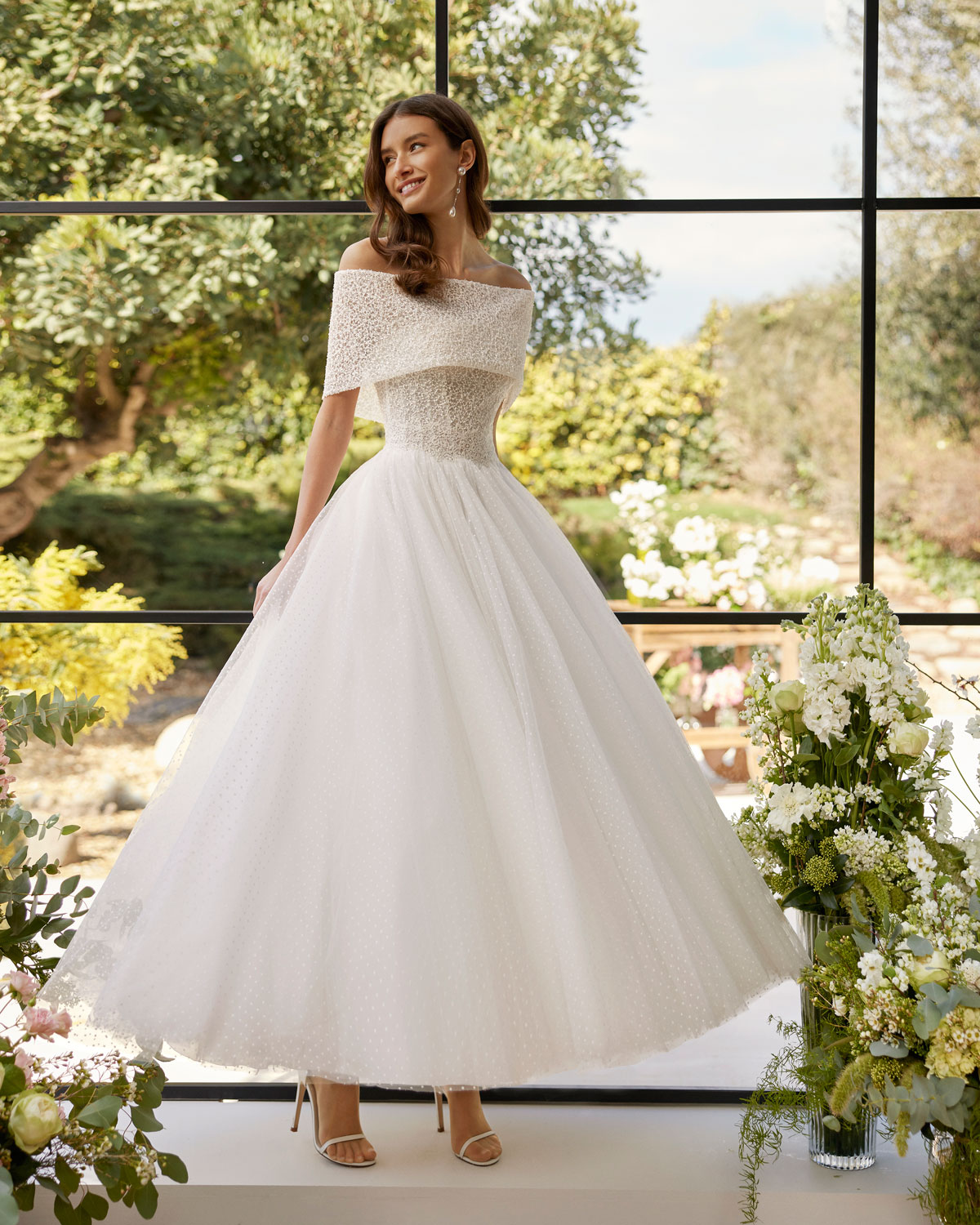 A ROSA CLARÁ COUTURE dirige-se à mulher contemporânea com VESTIDOS MIDI com saias de tule em franjas e caudas removíveis que são pura inspiração. Do decote caicai, podem combinar-se com os novos DECOTES ENVOLVENTES removíveis e delicados, mangas abalonadas que a assinatura introduz para reforçar a tendência MULTILOOK, que permite exibir dois looks diferentes na cerimónia e na festa após a mesma. |