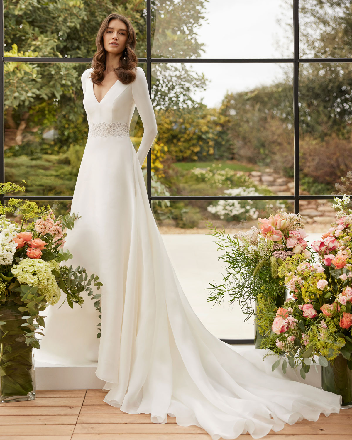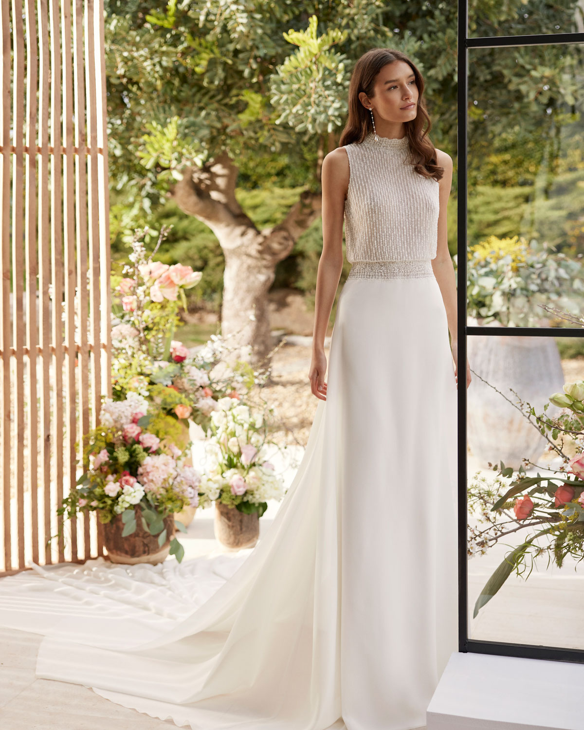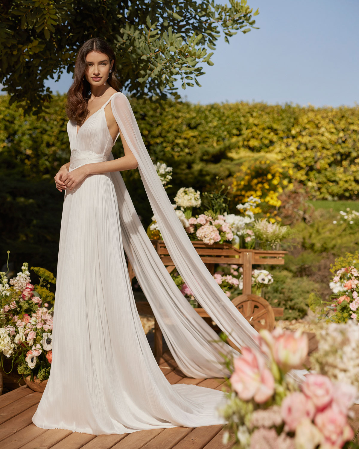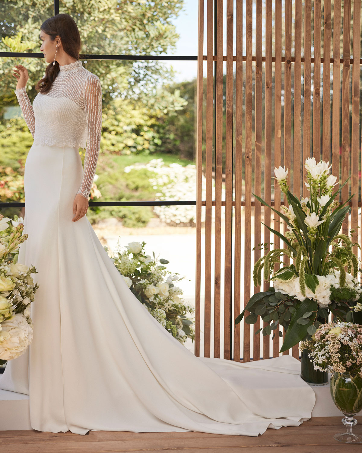 A ROSA CLARÁ COUTURE dirige-se à mulher contemporânea com VESTIDOS MIDI com saias de tule em franjas e caudas removíveis que são pura inspiração. Do decote caicai, podem combinar-se com os novos DECOTES ENVOLVENTES removíveis e delicados, mangas abalonadas que a assinatura introduz para reforçar a tendência MULTILOOK, que permite exibir dois looks diferentes na cerimónia e na festa após a mesma. |