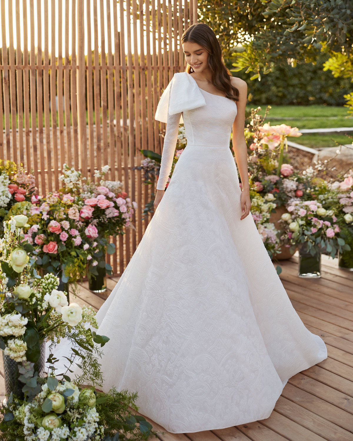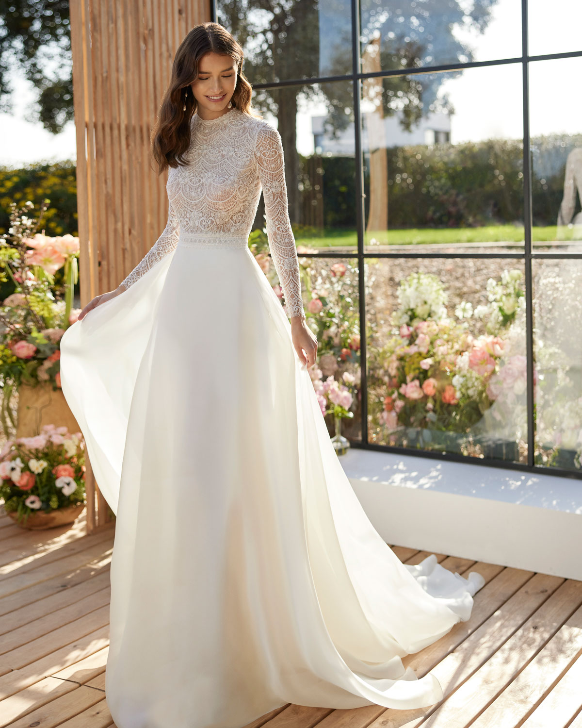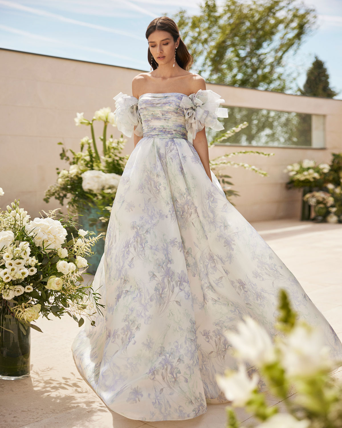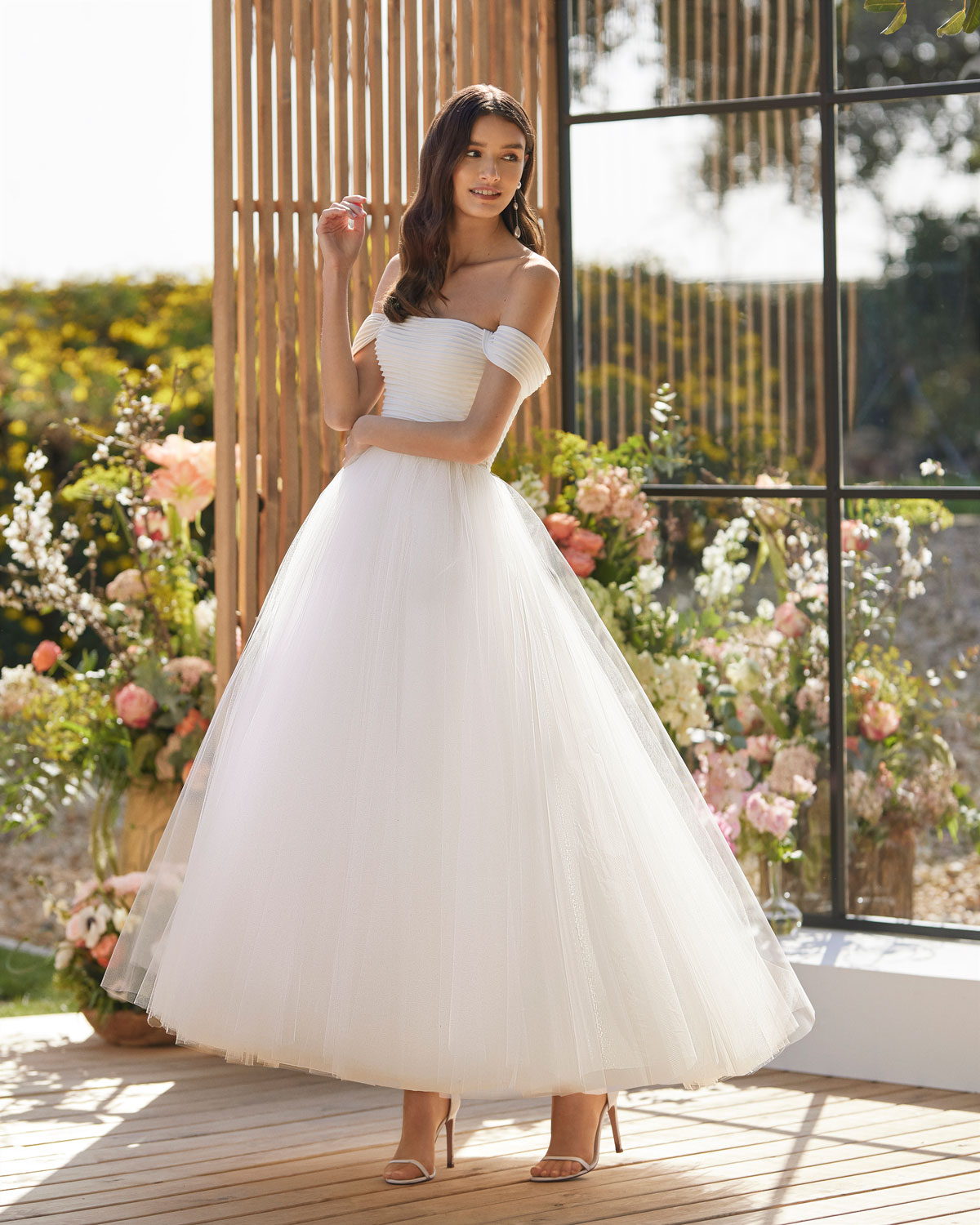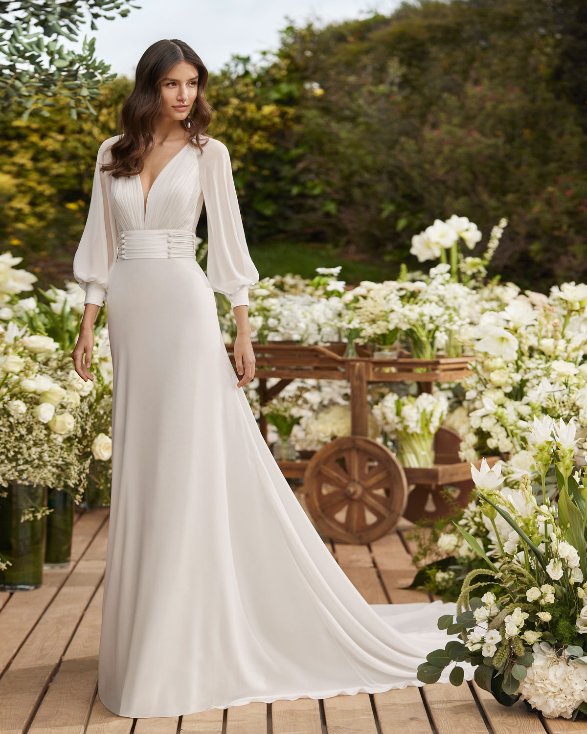 A ROSA CLARÁ COUTURE dirige-se à mulher contemporânea com VESTIDOS MIDI com saias de tule em franjas e caudas removíveis que são pura inspiração. Do decote caicai, podem combinar-se com os novos DECOTES ENVOLVENTES removíveis e delicados, mangas abalonadas que a assinatura introduz para reforçar a tendência MULTILOOK, que permite exibir dois looks diferentes na cerimónia e na festa após a mesma. |
